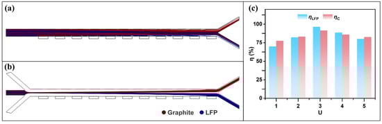 The sheath-to-sample flow rate ratio refers to the ratio of the particle flow rate to the flow rates of the sheath streams on both sides. Figure 8a,b show the particle trajectories with and without sheath flow, respectively. Particles located near the channel walls are easily captured under the influence of DEP and MAP forces. However, graphite particles on the side away from the electrodes and LFP particles on the side away from the ferromagnetic components experience weaker forces and thus fail to reach the desired outlet within the limited channel length. In this case, introducing sheath flows on both sides enables hydrodynamic focusing of the mixed particles, which effectively resolves the issue. To determine an appropriate sheath-to-sample flow rate ratio, the particle stream velocity was kept constant, while the base velocity of the sheath flow was varied to observe the changes in particle trajectories. Defining the sheath-to-sample flow rate ratio as U, Figure 8c shows the separation efficiency of LFP and graphite as a function of U in the range of 1 to 5. When U = 3, the separation efficiency of LFP and graphite reaches its maximum. This is because a lower flow rate ratio leads to a more dispersed distribution of the mixed particles as they enter the separation channel. Particles of the same type located at different lateral positions experience varying forces; as a result, some near the channel walls may already be captured by the electrodes, while others may not be sufficiently affected by the external forces. On the other hand, when the flow rate ratio is too high, the focused particle stream remains confined to the center of the channel. Within the limited channel length, many particles do not experience sufficient lateral deflection and exit through the undesired outlet.