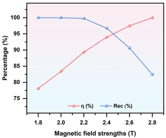 Separation efficiency and recovery rate of LFP under different applied magnetic field strengths. (with = 100 V, u = 30 mm/s, and f = 1 kHz).