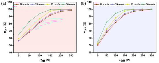 To evaluate the effect of applied voltage and flow rate on the separation of graphite and LFP particles, simulations were conducted with various inlet velocities and applied voltages ranging from 100 V to 300 V. According to Equation (1), the DEP force is proportional to the gradient of the non-uniform electric field, which increases exponentially with higher applied voltage. Theoretically, the separation efficiency of particles is expected to improve with increasing voltage. As shown in Figure 10a, the particle separation efficiency is positively correlated with the applied voltage. When the voltage increases from 100 V to 300 V, the separation efficiency rises from 56.84% to 98.76%. This trend indicates that higher voltages significantly enhance the lateral dielectrophoretic migration of particles, thereby improving the separation performance. However, when the voltage exceeds 200 V, the efficiency growth tends to saturate, while the Joule heating effect intensifies. If the temperature rise exceeds 10 K, additional cooling systems may be required, leading to increased equipment and operational costs.
