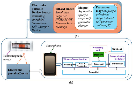 As a proof of concept we simulate the operation of RRAM units, included in a portable, smartphone-like device, schematically presented Figure 1a: A circuit-level integration approach for RRAM-compute blocks for self-energy generation Figure 1b SoC Block diagram of various modules of the wireless smartphone self-charging device. The simulation of the RRAM device uses a 1T2R cell design with an optimized cylinder-shaped permanent magnet; the proposed concept shows the auto energy generation for wireless smartphone self-charging applications. Hence, an improvement in total power is obtained. In this study, we present an implementation that consists of a memristor-based 1T2R optimized using IHP 130 nm SG13S technology and prove the concept by means of the finite-element magneto-static simulations that allow for the combination of RRAM device technology into CMOS designs.