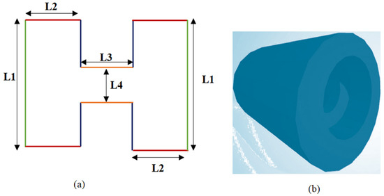 The main idea is to use a single magnet of a specially-designed shape, magnetized uniformly in one direction. In Figure 9a, we illustrate the shape and structure of our proposed permanent magnet. The cylindrical shape with notches (Figure 9b) under consideration allows for the adherence to a planar problem because of its rotational symmetry. Table 3 displays the geometric details.