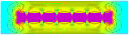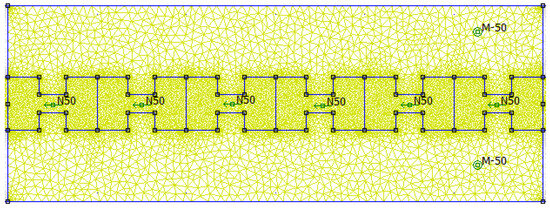 The FEMM software (https://www.femm.info/wiki/HomePage) was used to perform FEM computations of magnetic-flux density. The mesh design and application of the boundary constraints must require special consideration. A triangular mesh and the first-type (Dirichlet) boundary conditions were used. The convergence tests were used to calculate its density [20]. The meshing for the magnet geometry under consideration is shown in Figure 11. The mesh structure is tighter toward the magnet’s surface, where field gradients are more pronounced. The time dependence of the calculated flux is modeled by examining various displacements between the coil and magnet while assuming harmonic motion [19]. To simplify the process, the angular frequency was fixed to ω = 1 s 1 . Equation (1) is carried out in terms of a finite-difference method to the time derivative, and Equation (2) applies the average value B of the magnetic flux density for a given cross-section. The main advantage of these suggested magnets is that they produce a sufficient voltage for charging an electronic device battery in normal circumstances. The evaluations are presented in the next section.