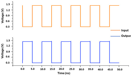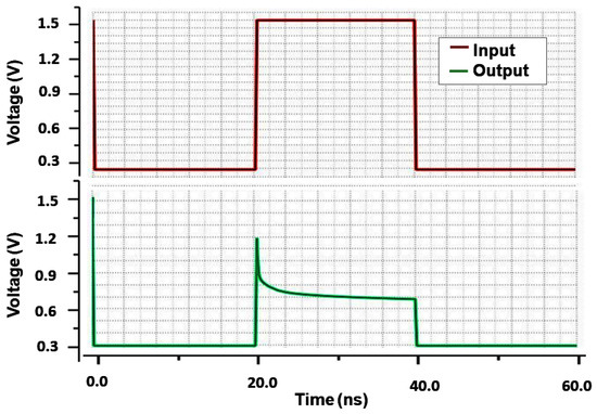 Consequently, it is possible to ascertain the PMOS transistor’s passing current and output node voltage. According to our memristor model, the R O N and R O F F values are different. Both memristors stay in the on state because the current flows to their positive sides. Memristors with identical resistance and current could be used to extract an output power, which would be 1.5 V at that level. If 1.5 V is the input voltage, the condition will change. If the voltage difference (VSG) is less than the edge voltage (VTP) of the PMOS transistor, the PMOS switch is off. While memristor R2 stays in the on position, memristor R1 stays in the off position due to the electrical current produced by the input voltage. Acquiescent resistance R O F F generates a circumstance with no current flow. In (3), the voltage output is as follows [22,23]. By changing the actual values of R O N and R O F F , it is clear that the result node is set to roughly 0 volts. In other words, such a design approach aims to achieve the same goal as the perfect ideal non-volatile output. The simulation results are presented in the next section.