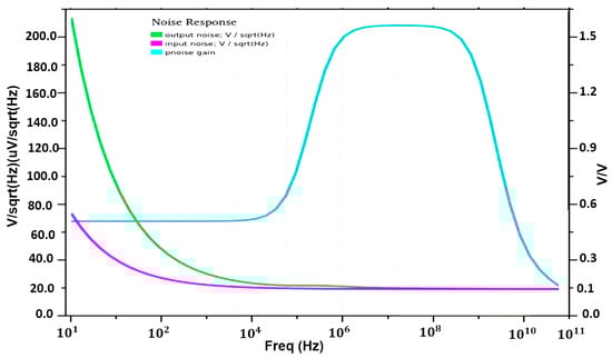 This part demonstrates the usefulness of optimizing our proposed structure for usage with RRAM electronic devices. As previously explained, the suggested 1T2R architecture can keep its pre-programmed state, operating similarly to traditional SRAM cell behavior. The designed 1T2R and other reference circuits have been modified and simulated using industry-standard 130 nm CMOS technology and device size. The simulation results given were obtained using Cadence Virtuoso. The entire simulations are performed considering 1.5 V of the input voltage at the operational temperature of T = 27 °C while consuming a total power of 17.67 µW. A memristor-based feedback system has been used to analyze the read/write operation and non-volatility output. The circuit has a non-volatile output that is memristor-received. To examine the non-volatility characteristics of the proposed design, the most critical concerns, such as read and write time concerns, should be kept in mind. The output memristor (R2) is connected to the input memristor (R1) through a feedback-wired loop network. As in the state of R1, the input values are defined. The voltage at the output node is tuned to around 0 volts whenever the actual values of R O N and R O F F are substituted. This indicates that the circuit functions similarly to an ideal inverter. The transient analysis of the presented design is displayed in Figure 12. The rise and fall times are 5 ns. The various memristor variables for V I N = 1 and V I N = 0 and the proposed design based on memristor are shown in Table 2. The writing term is the shortest possible duration of time the input pulse must have been present for the memristor state to change from w = 0 ( R O F F ) to = D ( R O N ) [23]. In the suggested circuit, the R2 memristor will stay at R O N after the write time has elapsed. Following the writing time, if the input voltage V I N causes the output response for V O U T = 1, the memristor R1 will change. In this particular scenario, all memristors are enabled. Whenever V O U T = 0, the memristor condition is fixed allowing the significances in Table 2. Under these circumstances, R2 is on and R1 is off. In this case, the zero output value is expected. Figure 13 displays the simulation outcome for this condition. It will be beneficial in defining the circuit’s routine as well as the memristor R1’s intended function as an SRAM cell. Circuits develop non-volatile performances as a result. Figure 14 presents the noise performance simulation results, illustrating the impact of input-referred noise, output noise, and phase noise margin for the suggested design. The correlation between frequency (Hz) and V/sqrt referred noise (V/Hz) is displayed in the graph plot. Table 4 shows the measured parameters of the presented RRAM design. The suggested system design is an innovative concept that focuses on efficient memory utilization for self-charging devices.