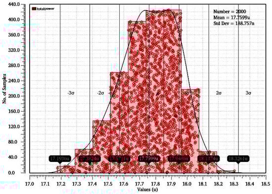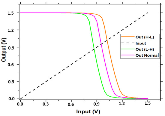 Monte Carlo (MC) is a popular statistical technique for calculating the probability of certain events under an unknown distribution. Figure 15 shows the results of Monte Carlo simulations of 2000 samples for the total power utilization of the suggested RRAM memristor-based design under different processes and mismatch operations. The overall power usage is around 17.75 µW, with a minor standard deviation of 1.85 µ. We evaluate the hysteresis curve for the proposed circuit, as depicted in Figure 16, and point to the outputs H-L and L-H. This curve demonstrates enhanced performance when bootstrapping the voltage drop. These circuits under consideration have a high-to-low voltage transfer characteristic (VTC) transition. H-L and L-H are the circuit’s upper and lower threshold voltages; outnormal is the input and output crosspoint voltage. Table 5 presents a comparison between the suggested RRAM (1T2R) design and designs that have been proposed in the literature.