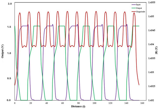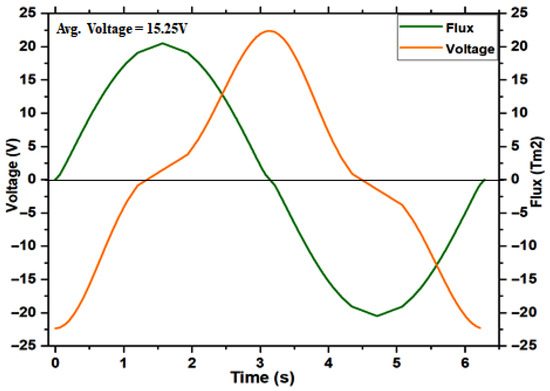 In this section, we will evaluate the self-generation system through numerical simulation with finite-element methods; to prove that the proposed solution may be successfully implemented in a self-charging device. We use FEMM Ansys software to achieve the simulation results that are depicted. The application of the permanent magnet for self-energy generation part has been explained in the previous section. Based on this assumption led to the use of the law of motion from the Maxwell equation for the overall investigation. It can charge the battery in both walking mode and shaking mode. Walking motion generates mechanical energy that may be transformed into electric energy, continually charging the battery and prolonging its useful life. The permanent magnetization is constant and aligned with the horizontal axis, which equals the oscillation direction. Figure 17 depicts the corresponding permanent magnet equilibrium position. The magnetic flux lines were computed for the magnet in the coil’s equilibrium position. Figure 18 depicts that the induced voltage is a function of the negative time derivative, the calculated variation in permanent magnetic flux as a function of time concerning the equilibrium state. The computed flux accurately reproduced the sinusoidal curve according to the above mentioned geometry. Figure 19 depicts the magnetic flux density in Tesla measured in mm as a function of the permanent magnet. The computed flux reasonably well and accurately reproduces a sinusoidal curve. The resulting voltage amplitude of 17 V, although the average absolute voltage is 15.25 V, is the lowest input value for an established rectifier circuit, which should be sufficient for the proposed harvester for an embedded smartphone self-charging application.