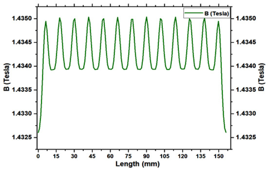 Figure 10 depicts the entire procedure diagram for the magnetization representing technique. We adopt the magnetic characteristics of a cutting-edge sintered magnet (NdFeB-50) with a high enough remanent magnetization. The specially designed notches in the magnet reduce the weight and improve the required inhomogeneity of the resultant field, even for uniaxial magnetization, as shown in Figure 11, which is essential for a non-zero time derivative in Equation (1).