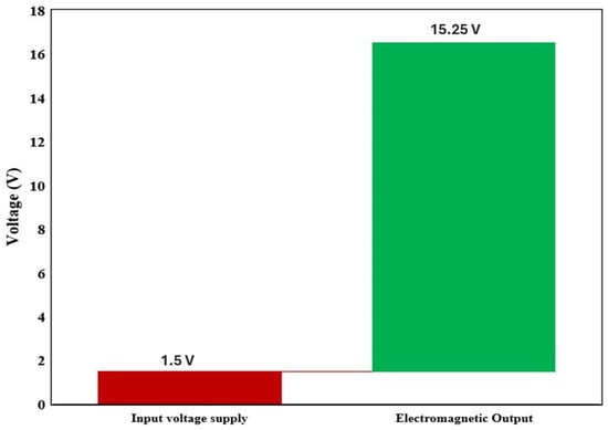 In this part, we prove the efficacy of our suggested RRAM Joint Model Optimizations, which have been programmed to generate a self-charging process. The effectiveness of the proposed joint model in converting and amplifying the input energy is demonstrated in Figure 20, which graphically supports this significant voltage amplification. The suggested approach combines self-characterization processes to improve energy harvesting and storage efficiency. Figure 21 shows the difference between the 1.5 V input voltage and the 15.25 V magnetically produced output. Although the device uses a modest input supply of 1.5 V, magnetic induction generates an impressive 15.25 V output. This output exceeds the standard operating voltage of most embedded electronic devices, which typically operates within a 12V range. Table 6 shows the measured parameters of the proposed hybrid joint model. Based on these promising results, this evaluation indicates the effectiveness of the smartphone self-charging device. We believe that this performance validates our model as a more advanced and reliable alternative in the field of smart self-charging devices.