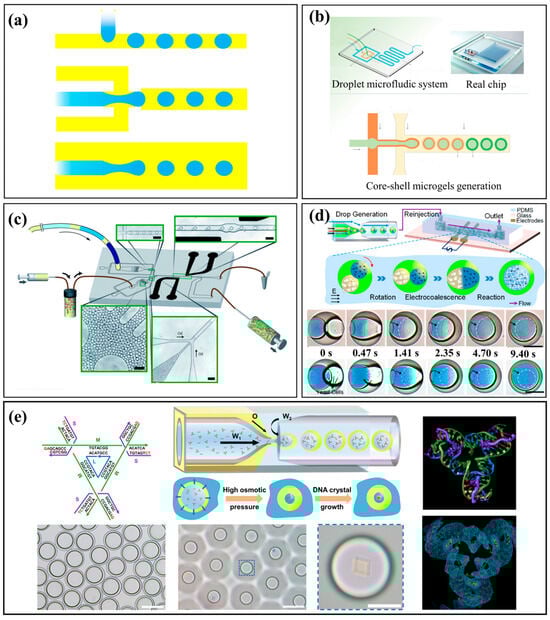 Droplet-based microfluidics. (a) Droplet generation using three types of microfluidic structures: cross-flow, flow-focusing, and co-flow. (b) One-step droplet microfluidic method to generate core–shell GelMA microgels [44]. Reprinted with permission from ref. [44]. Copyright 2019 Wiley. (c) A droplet-based microfluidic platform for picolitre-scale combinatorial synthesis enabled by an applied electric field [45]. Reprinted with permission from ref. [45]. Copyright 2012 Royal Society of Chemistry. (d) A microfluidic strategy for continuous microreactions by applying external AC electrical signals to trigger core coalescence within double-emulsion droplets [46]. Reprinted with permission from ref. [46]. Copyright 2017 American Chemical Society. (e) A microfluidic approach using double-emulsion droplets as nanoliter-scale reactors to precisely control the self-assembly of monodisperse 3D DNA crystals [47]. Reprinted with permission from ref. [47]. Copyright 2025 American Chemical Society.