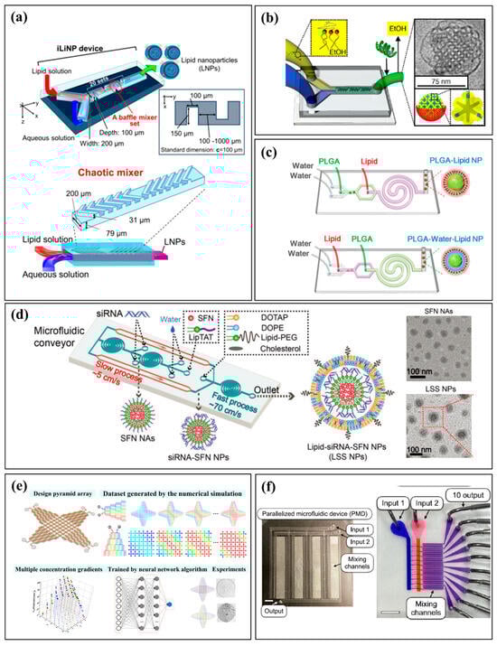Continuous-flow microfluidics involve the constant pumping and mixing of fluids within a single-phase stream. The high-precision fluid manipulation capabilities of these systems enable precise control of experimental parameters—such as flow rates, concentration and temperature—to ensure consistent material size and morphology. This continuous operation allows for high-throughput production. Common microfluidic geometries include T-shaped, Y-shaped, spiral and staggered herringbone micromixers [38]. T- and Y-shaped designs are widely used due to their simple fabrication, but they rely on molecular diffusion, resulting in low mixing efficiency and broad particle size distributions. To overcome this, advanced channel structures have been developed to enhance mixing without increasing system complexity [48]. For example, spiral and staggered herringbone micromixers improve reaction homogeneity by inducing secondary flows and chaotic advection, which increase the interfacial area between fluids and facilitate rapid, uniform mixing. This enhanced mixing improves the kinetics of solvent exchange and component distribution. Kimura et al. developed a baffle mixer that demonstrated more effective fluid blending than a standard chaotic mixer, enabling the synthesis of smaller, more consistent lipid nanoparticles under identical flow conditions (Figure 2a) [49]. Similarly, Kim et al. developed a platform with structurally enhanced chaotic mixing to produce uniform cubosomes as small as 75 nm, overcoming the size limitations of traditional methods and advancing the design of effective gene delivery vectors (Figure 2b) [50]. The synthesis of functional nanoparticles thus critically relies on precisely controlling flow dynamics and reactant assembly within the microfluidic chip. Efficient synthesis of structurally complex nanoparticles has been advanced by designing systems that enhance mixing and integrate multiple processes onto a single platform. For instance, Sun et al. developed a two-stage microfluidic device that precisely controls sequential mixing to fabricate polymer-lipid hybrid nanoparticles with tunable rigidity by adjusting the injection order of solutions (Figure 2c) [48]. Chen et al. designed a serial assembly platform that functions like a mini-conveyor to control the stepwise fabrication of lipid-siRNA-sorafenib nanoparticles, enabling continuous production of multifunctional nanosystems with high encapsulation efficiency (Figure 2d) [4]. Such structurally enhanced mixing leads to more reproducible synthesis conditions and yields nanoparticles with narrower size distributions. This precision is particularly advantageous for multicomponent systems requiring sequential assembly of functional layers, such as drug cores and lipid shells.