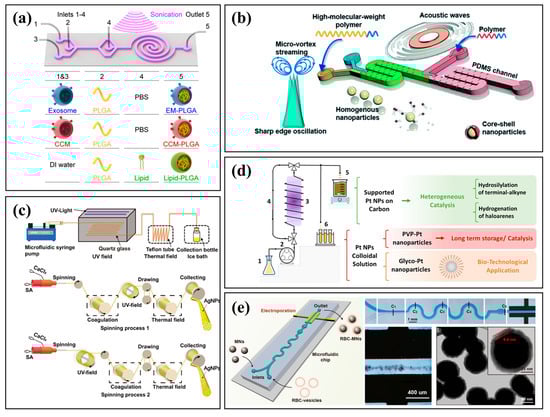 Microfluidic synthesis enhanced by external fields provides a versatile platform for precision microscale chemical processing. By incorporating electric, magnetic, acoustic, or thermal fields, researchers can actively regulate fluid dynamics, particle manipulation, and reaction kinetics in real time. These stimuli improve mixing efficiency, enable selective transport, and allow dynamic tuning of reaction conditions, which is particularly beneficial for synthesizing complex nanomaterials and smart drug delivery systems. For example, Liu et al. used an external acoustic field to efficiently assemble membrane-coated nanoparticles, simplifying fabrication while improving immune evasion and tumor-targeting efficiency (Figure 3a) [54]. Similarly, Zhao et al. engineered an acoustofluidic platform that enables ultrafast micromixing to synthesize size-tunable, high-molecular-weight polymeric nanoparticles with core–shell structures (Figure 3b) [55]. Other fields have also been integrated: Liu et al. coupled ultraviolet and thermal fields to fabricate AgNP-loaded alginate fibers with enhanced uniformity and antibacterial performance (Figure 3c) [56]; Marelli et al. developed a photo-driven method to produce ultrasmall (~1.3 nm) platinum nanoparticles as stable, efficient catalysts (Figure 3d) [57]; and Rao et al. used electroporation to synthesize erythrocyte membrane-coated magnetic nanoparticles with improved stability and circulation (Figure 3e) [58]. The synergy between microfluidic confinement and external physical fields enhances mixing, selectivity, and product uniformity, opening new avenues for automated synthesis and scalable manufacturing.