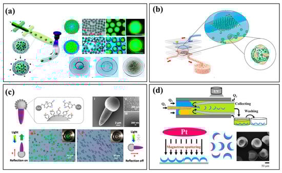 Core–shell microparticles, which consist of an inner core encapsulated within a functional outer shell [65], can be fabricated with high precision using microfluidics to control the flow of core and shell phases [20,66]. This approach offers superior control over particle size, core-to-shell ratio, and material composition compared to conventional methods. For example, Dinh et al. fabricated reservoir microcapsules that overcome the typical trade-off between hydrogel size and drug-loading capacity (Figure 4a) [67], while Wu et al. developed a high-throughput system to generate uniform hydrogel microspheres for biomedical applications (Figure 4b) [68]. Microfluidics also enables the synthesis of complex morphologies, such as the multifunctional photonic Janus particles reported by He et al. (Figure 4c) [69] and the bowl-shaped micromotors with precisely controlled Pt-coated surfaces developed by Wang et al. (Figure 4d) [70]. Furthermore, external fields can be integrated for advanced particle manipulation. Jin et al. used a focused surface acoustic wave (FSAW) platform to create multilayered core–shell microcapsules by manipulating particles with acoustic radiation forces [71]. Owing to their customizable properties and biocompatibility, polymeric and hydrogel microparticles are widely used in biomedicine. They can be engineered as drug delivery vehicles for controlled and sustained release [72], as multifunctional platforms for cell delivery and tissue scaffolding [73], or as encoded particles for multiplexed bioassays, improving the efficiency and scalability of diagnostic platforms. Polymeric and hydrogel microparticles are widely used in biomedical fields due to their customizable properties and excellent biocompatibility.