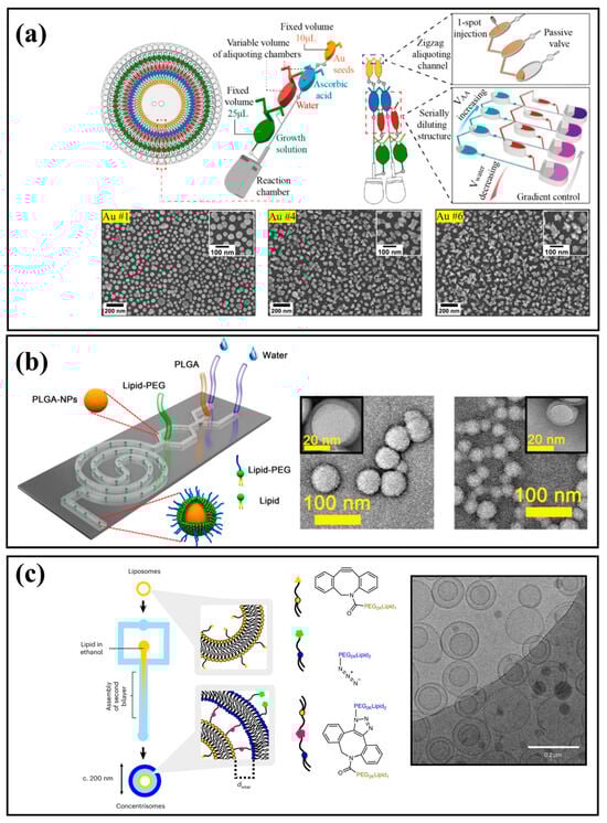 Nanoparticle synthesis and applications. (a) Synthesis of gold nanoparticles with tunable morphologies [74]. Reprinted from Chemical Engineering Journal, Vol 452/Part1, Hiep Van Nguyen et al., Serially diluting centrifugal microfluidics for high-throughput gold nanoparticle synthesis using an automated and portable workstation, Pages No.139044, Copyright (2022), with permission from Elsevier. (b) Synthesis of monodisperse lipid–PLGA hybrid nanoparticles [78]. Reprinted from [78], with the permission of AIP Publishing. (c) Nanoscale liposome-in-liposome particles [79]. Open access article distributed under the terms of the Creative Commons CC BY license.