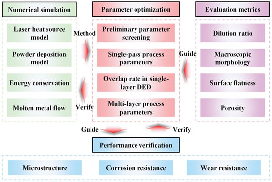 In summary, addressing the current research gaps on DED of Hastelloy X on 50CrVA substrates and the limitations of conventional process parameter optimization methods, this study aims to achieve the following objectives: First, to establish a thermo-fluid coupled numerical simulation model for the DED process of Hastelloy X on 50CrVA substrates and validate its accuracy. Second, to develop an integrated optimization method by combining the thermo-fluid coupled model with orthogonal experiments. Third, to assess the corrosion and wear resistance of claddings fabricated by the optimized parameters, verifying whether the Hastelloy X claddings meet the high-performance repair requirements of 50CrVA aircraft landing gear. This work can provide engineering application support for the additive repair of dissimilar 50CrVA landing gears. The specific research framework is illustrated in Figure 1.