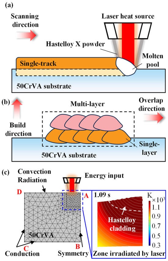 Figure 2 illustrates the detailed working principle of the DED technology. During the deposition of Hastelloy X, the energy emitted by the laser heat source acts on the substrate surface and the coaxially delivered Hastelloy X powder carried by inert gas, causing the powder to melt and rapidly form a molten pool containing mixed metallic materials at the laser spot. Due to the temperature gradient on the molten pool surface, corresponding surface tension gradients are generated, driving convection within the liquid metal and thereby promoting the redistribution of energy inside the pool. As the laser beam moves along the scanning direction, a new molten pool forms in the directly irradiated zone, while the non-irradiated zone cools and solidifies rapidly, ultimately producing a single-track cladding along the laser path. In Figure 2c, mesh refinement is applied only in the directly laser-irradiated zone to optimize computational efficiency. Boundaries BC and CD are subjected to heat conduction. The AD surface, which is the substrate surface under direct laser irradiation, experiences heat conduction, convection, and radiation due to laser heating. To simplify the computation, a symmetric boundary condition is applied to the AB surface. Since the DED process occurs in a sealed inert gas chamber where gas flow is relatively stable, the convective heat transfer coefficient is set as a constant. The single-track cladding serves as the fundamental building unit. Through horizontal overlapping of individual tracks, a single-layer cladding is formed. These single layers are then stacked vertically, ultimately constructing a multi-layer cladding structure.