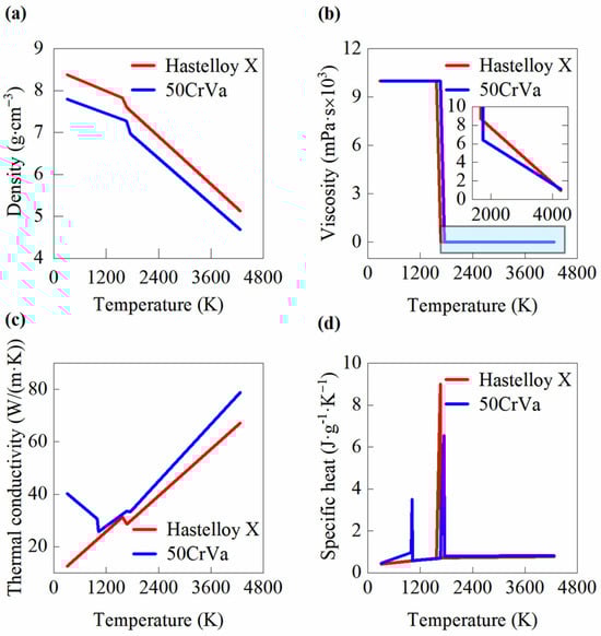 Temperature-dependent thermal properties of 50CrVA and Hastelloy X materials. (a) Density; (b) Viscosity; (c) Thermal conductivity; (d) Specific heat. The thermal properties of the material change at the solid–liquid phase transition temperature (as seen in Table 1).