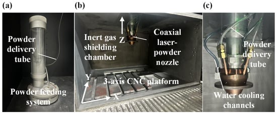 The self-developed DED equipment. (a) Powder feeding system; (b) Inert gas shielding chamber with a 3-axis CNC platform; (c) Coaxial laser–powder nozzle.