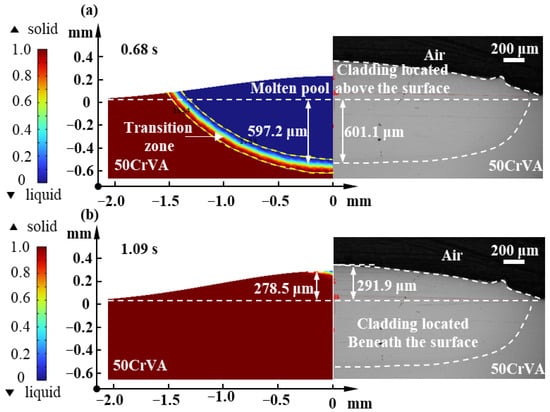 To establish an optimization method of the process parameters for single-track cladding, this section first validates the thermal–flow coupled FEM. Under 2000 W in p, 1.5 g/min in f, and 210 mm/min in v, the calculated and experimentally measured molten pool dimensions (D and H) are compared. As shown in Figure 5, the simulated cladding exhibits 278.5 μm in H and 597.2 μm in D, while the experimental results show 291.9 μm in H of and 601.1 μm in D. In this simulation, the laser heat source continuously inputs energy into the substrate surface over time, leading to a rise in substrate temperature. Surface melting occurs, and the molten Hastelloy forms a molten pool. When the time reaches 0.68 s, the molten pool reaches its maximum depth, which is defined as the cladding depth. At this stage, the molten pool has not yet cooled, and additional Hastelloy powder continues to enter the molten pool, meaning the molten height at this stage does not represent the final cladding height. When the time reaches 1.09 s, the molten pool has almost completely cooled, and the molten height at this moment is considered the final cladding height. The relative errors between the simulated and experimental results are calculated to be 4.6% in height and 0.6% in depth, indicating good agreement and validating the effectiveness of the model for subsequent optimization experiments of DED parameters.