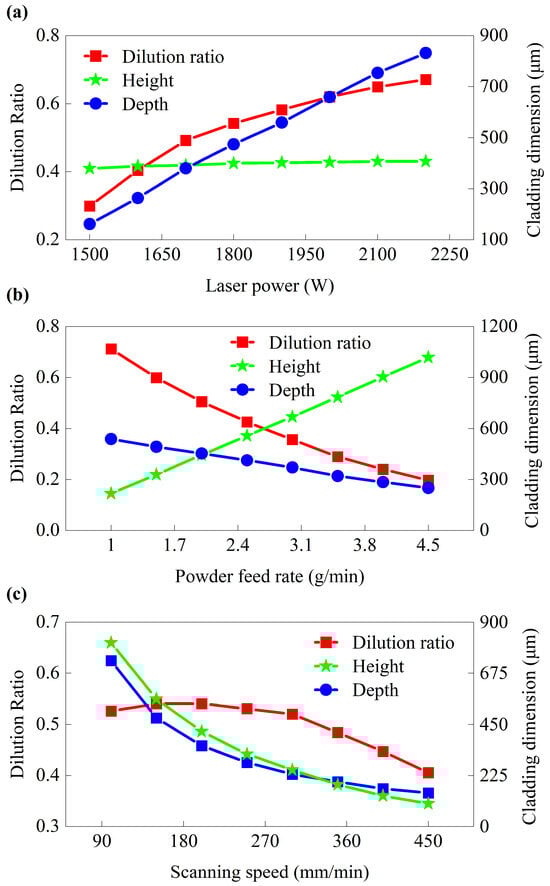 Dilution rate, height, and depth of the cladding layer with the change of process parameters using the FEM. (a) f = 1.8 g/min and v = 180 mm/min; (b) p = 1800 W and v = 180 mm/min; (c) p = 1800 W and f = 1.8 g/min.