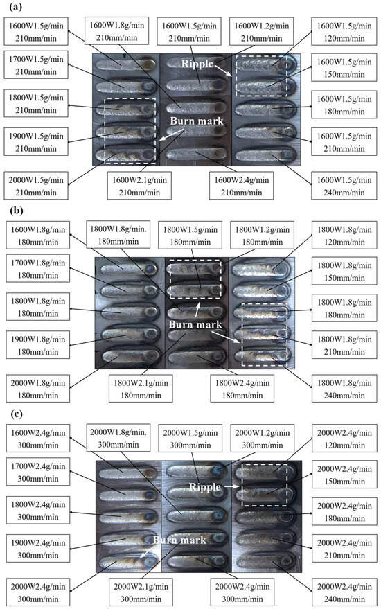 Macroscopic morphology of the cladding prepared in the three experimental groups: (a) Single-factor experiments based on 1600 W, 1.5 g/min, 210 mm/min; (b) Single-factor experiments based on 1800 W, 1.8 g/min, 180 mm/min, (c) Single-factor experiments based on 2000 W, 2.4 g/min, 300 mm/min.