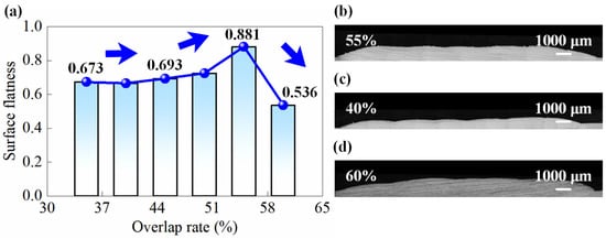 Experiment results of overlap rate optimization. (a) Variation of surface flatness with increasing overlap rate for single-layer cladding; (b–d) are cross-sections of single-layer cladding at the overlap rates of 55%, 40%, and 60%, respectively. As the overlap rate increases, the surface flatness of the single-layer cladding first improves and then deteriorates, reaching an optimal value of 0.88 at an overlap rate of 55%.