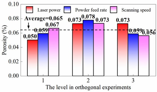 The porosity of multi-layer cladding at different levels for the three factors indicates laser power and powder feed rate exert significant influences on porosity. The minimum porosity is achieved when the laser power is set to level 1 and the powder feed rate is set to level 3.