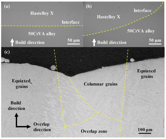 To observe the metallurgical bonding between the cladding layer and the substrate, the cladding layer is etched and examined for its microstructure. The microstructure of the cladding and its interface with the substrate is shown in Figure 10. The interface between the Hastelloy X cladding and the 50CrVA substrate is free of visible cracks or pores in Figure 10a,b, indicating excellent metallurgical bonding. Figure 10c reveals that the cladding contains no significant defects and consists mainly of columnar and equiaxed grains. The equiaxed grains are primarily distributed in the central regions of a single track, while the columnar grains are mainly located in the overlapping zones between adjacent tracks. During deposition, the extremely high cooling rate following the laser beam passage promotes grain nucleation over grain growth, resulting in the formation of fine equiaxed grains. Meanwhile, since the growth direction of grains follows the inverse thermal gradient, the columnar grains in the overlap zones grow perpendicular to the molten pool boundaries. This distinctive grain structure distribution is characteristic of the DED process under high thermal gradients and rapid cooling conditions [30]. In summary, an overlap rate of 55% ensures optimal ζ in single-layer cladding. By selecting the parameter combination of p at level 1 (1600 W), f at level 3 (2.4 g/min), and v at level 3 (240 mm/min), multi-layer cladding with minimal porosity can be achieved. Using these optimized parameters, a high-quality Hastelloy X layer can be fabricated on the 50CrVA substrate, characterized by a dense microstructure and excellent interfacial bonding.