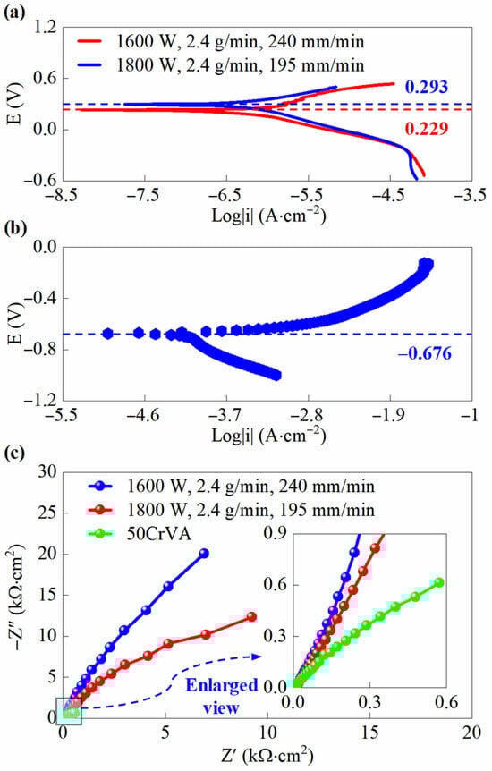 Polarization curve and impedance spectra of the cladding before and after process parameter optimization and substrate, where (1600 W, 2.4 g/min, 240 mm/min) represents the optimized parameter set and (1800 W, 2.4 g/min, 195 mm/min) corresponds to the pre-optimization parameters: (a) The polarization curve of cladding; (b) The polarization curve of substrate; (c) The impedance spectra of the cladding and the substrate.