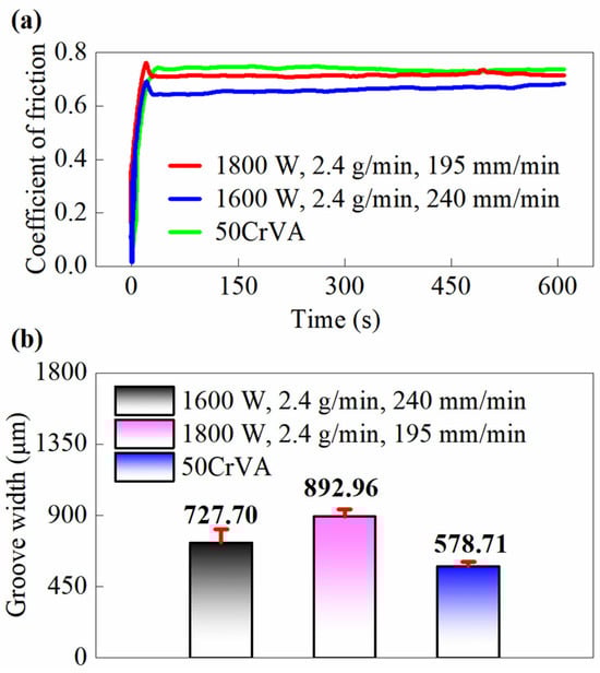 Friction coefficient and groove width of the cladding layer (before and after process parameter optimization) and substrate, where (1600 W, 2.4 g/min, 240 mm/min) represents the optimized parameter set and (1800 W, 2.4 g/min, 195 mm/min) corresponds to the pre-optimization parameters: (a) Coefficient of friction; (b) Groove width.
