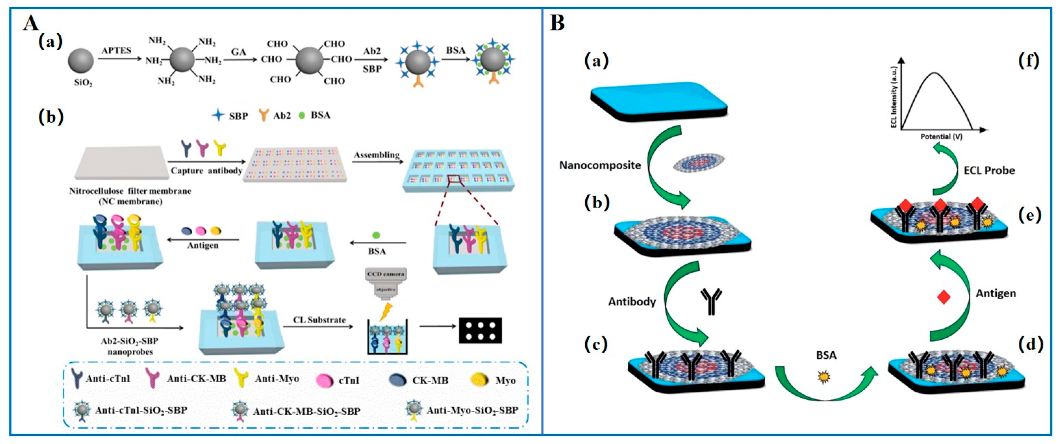 - Zhao, K.; Tang, M.; Wang, H.; Zhou, Z.; Wu, Y.; Liu, S. Simultaneous detection of three biomarkers related to acute myocardial infarction based on immunosensing biochip. Biosens. Bioelectron. 2019, 126, 767–772. [Google Scholar] [CrossRef]