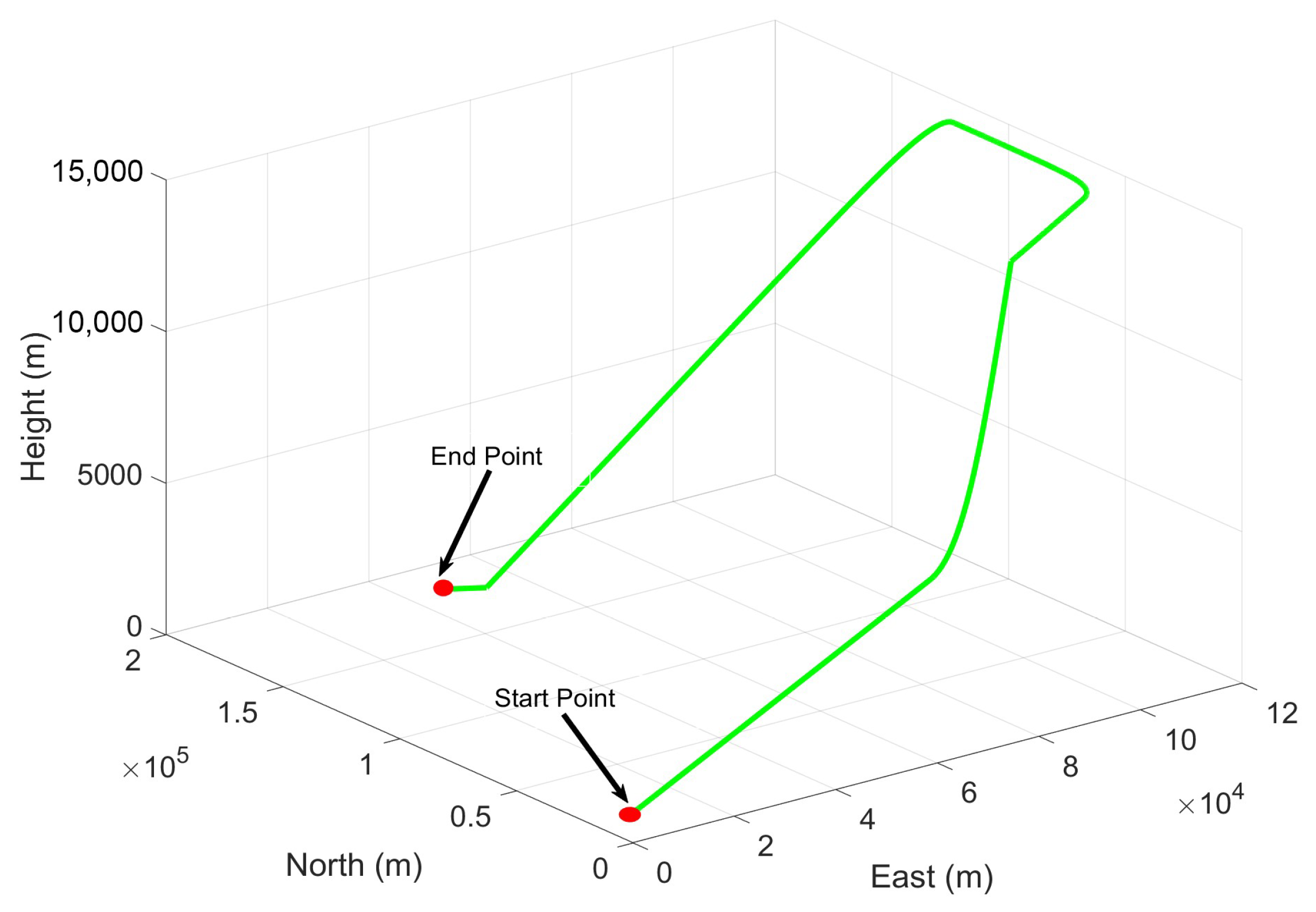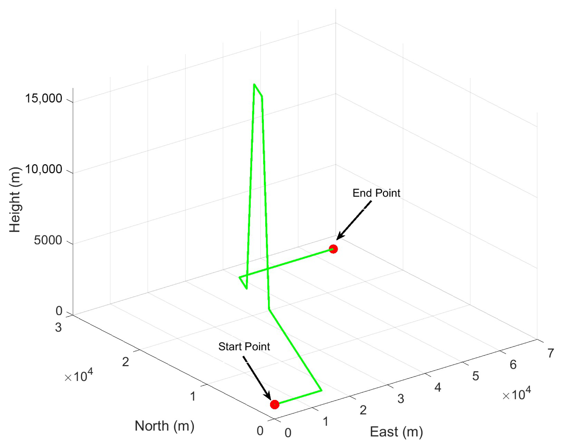 The aerodynamic characteristics of the aircraft | 1.8 (maximum lift coefficient), 0.02 (zero-lift drag coefficient), 0.04 (drag coefficient varies with lift coefficient), 2 (maximum Mach number), 670 m/s (maximum flight speed) | The stability derivatives of the aircraft | −0.3 (roll damping derivative), 0.2 (roll rate derivative), −0.5 (pitch damping derivative), −0.8 (angle of attack derivative), −0.4 (yaw damping derivative), 0.1 (yaw coupling derivative) |