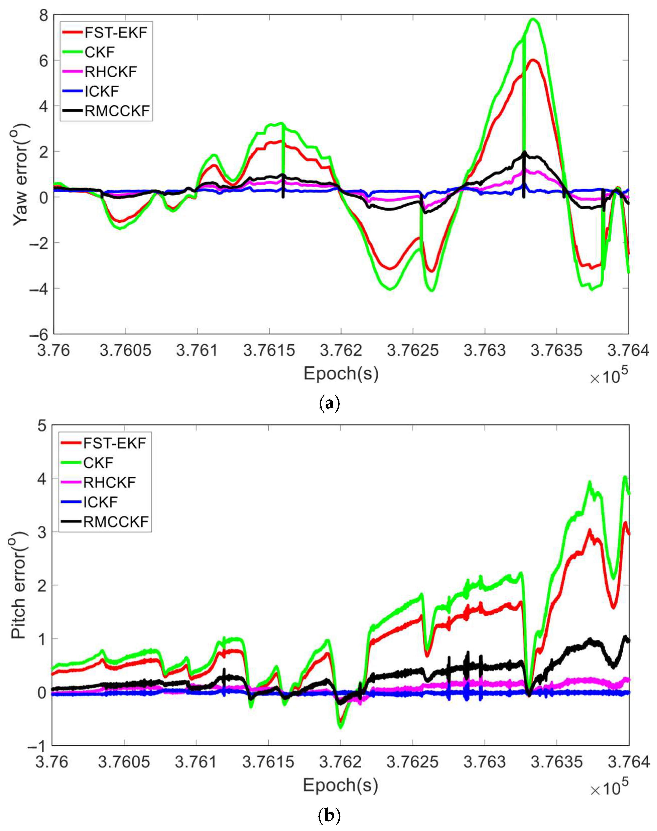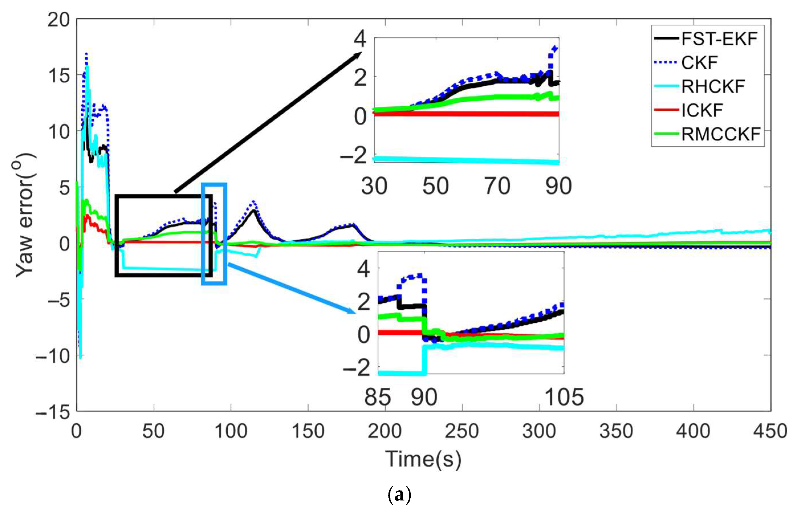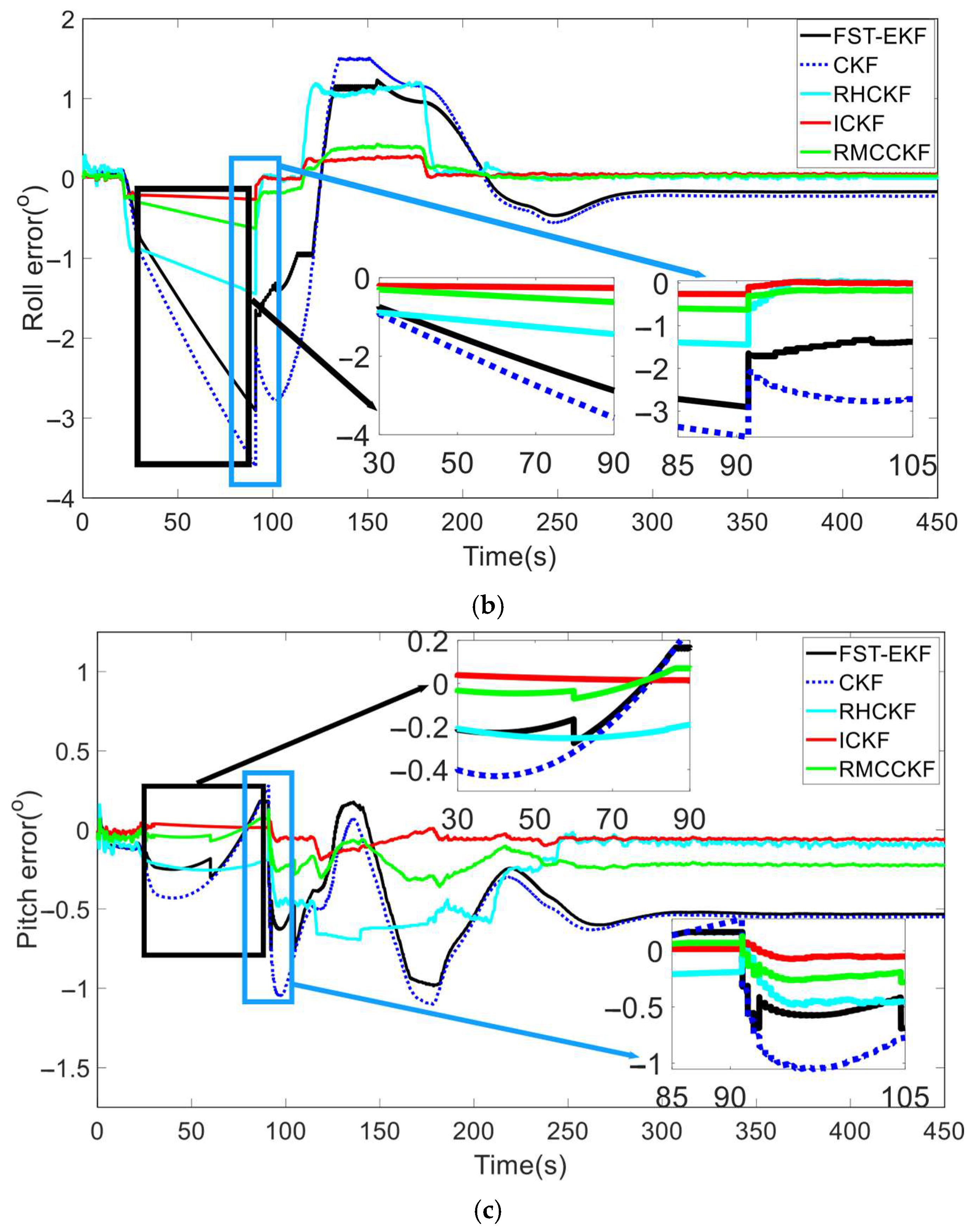 - Liu, D.; Chen, X.Y.; Xu, Y.; Liu, X.; Shi, C.F. Maximum correntropy generalized high-degree cubature Kalman filter with application to the attitude determination system of missile. Aerosp. Sci. Technol. 2019, 95, 105441. [Google Scholar] [CrossRef]