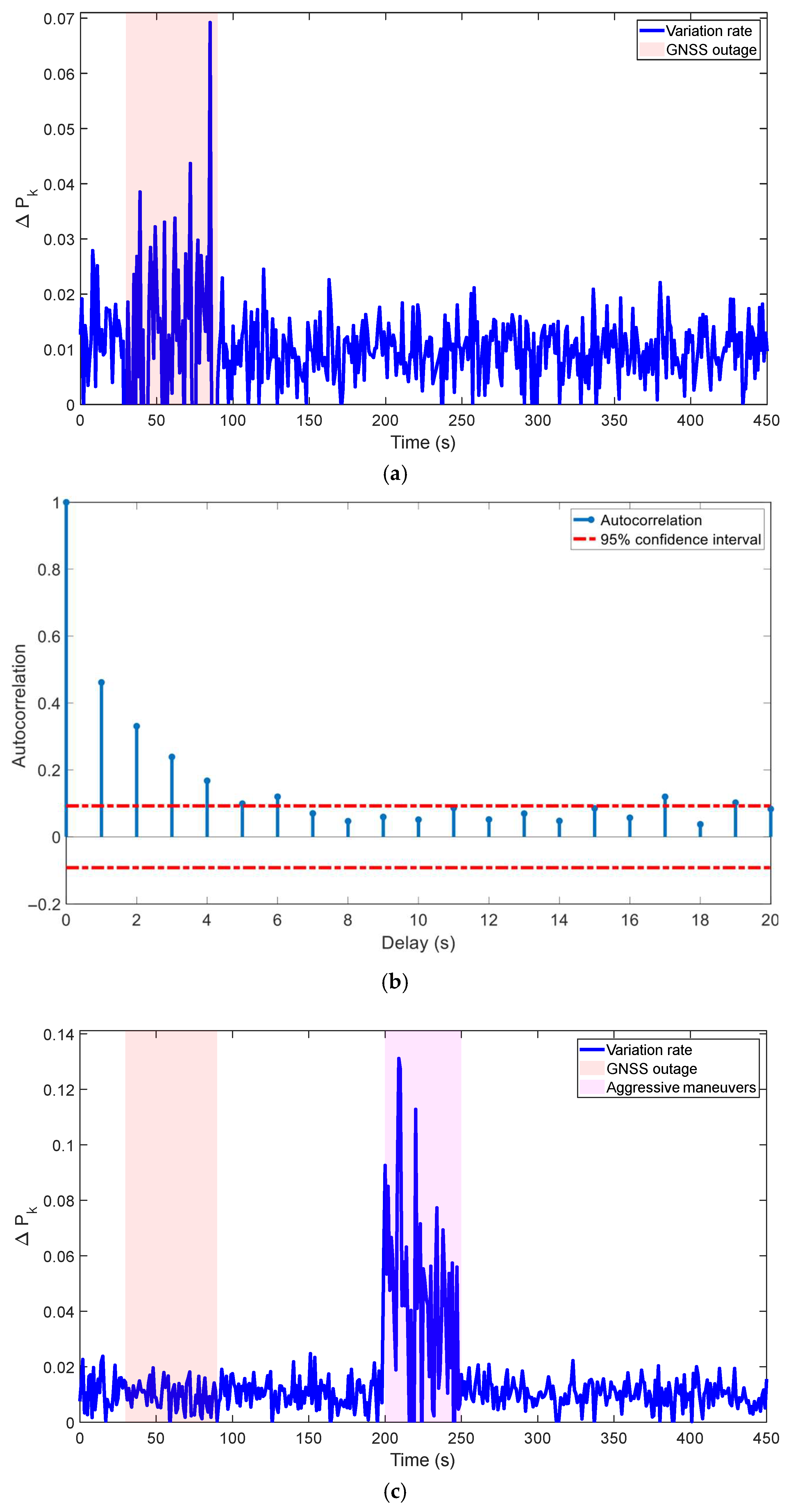 - Error Covariance Variation Rate: The Frobenius norm of the change in the predicted error covariance matrix between consecutive time steps, defined as , was computed. As depicted in Figure 11a, remains at a low level (<0.1) for the vast majority of the simulation, indicating that the filtering process is predominantly stable. A moderate increase in is observed during the GNSS outage period (30–90 s), which is expected due to the lack of measurement updates. Crucially, the variation rate remains bounded and does not exhibit divergent behavior.