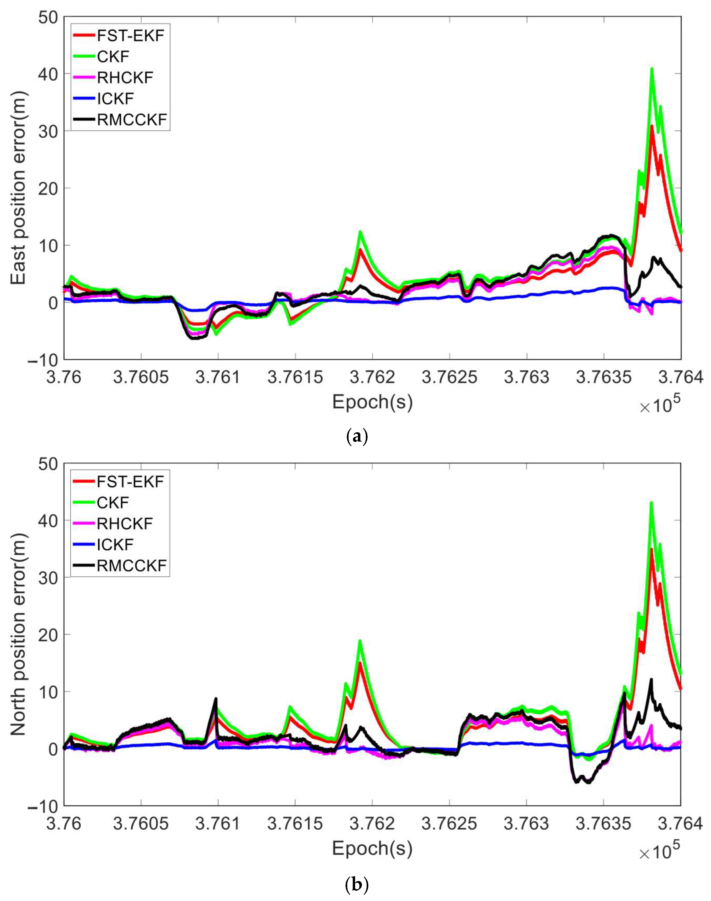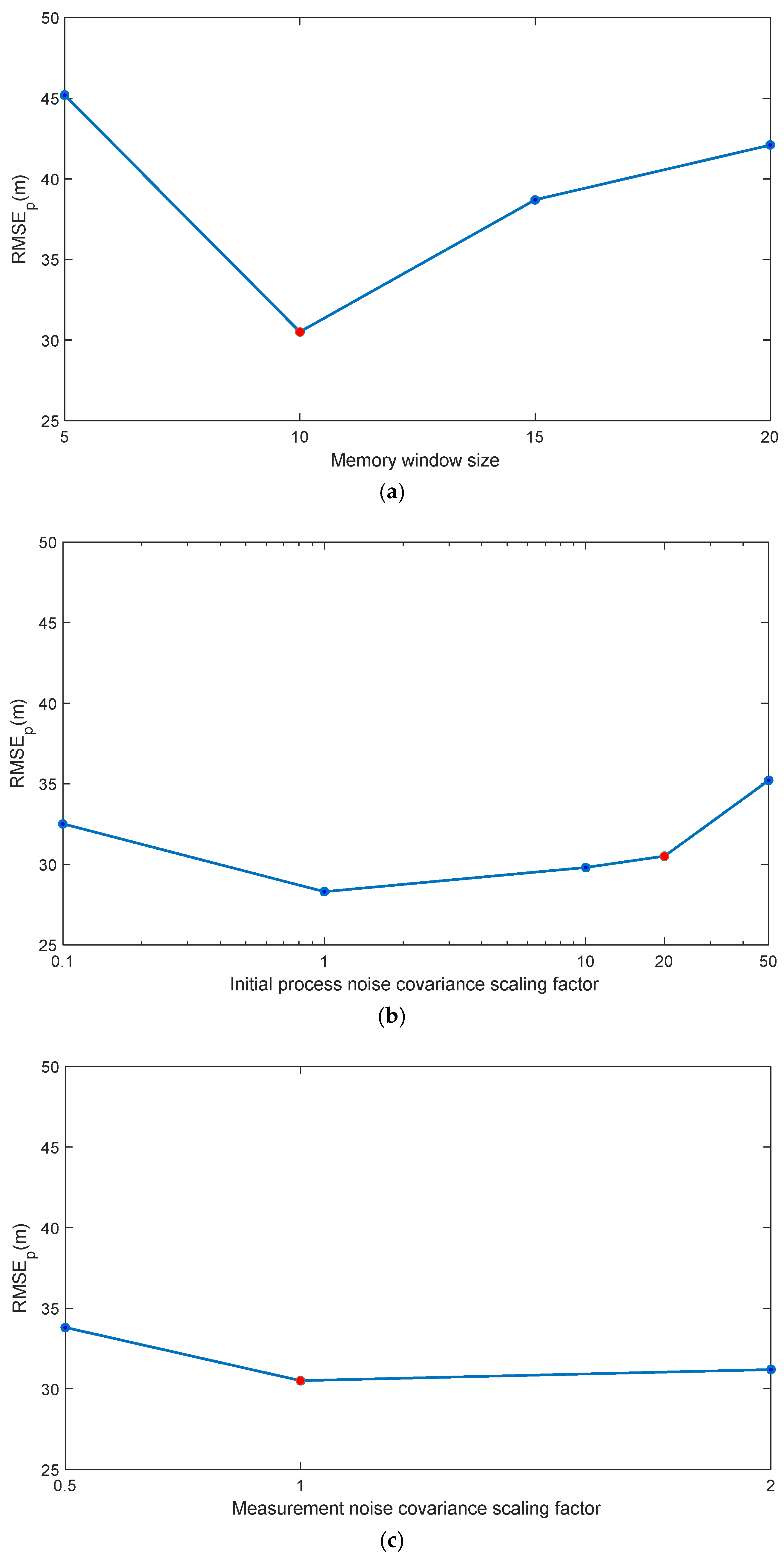 - Wu, Q.D.; Li, C.X.; Shen, T.; Xu, Y. Improved adaptive iterated extended Kalman filter for GNSS/INS/UWB-integrated fixed-point positioning. CMES-Comput. Model. Eng. Sci. 2023, 134, 1761–1772. [Google Scholar] [CrossRef]