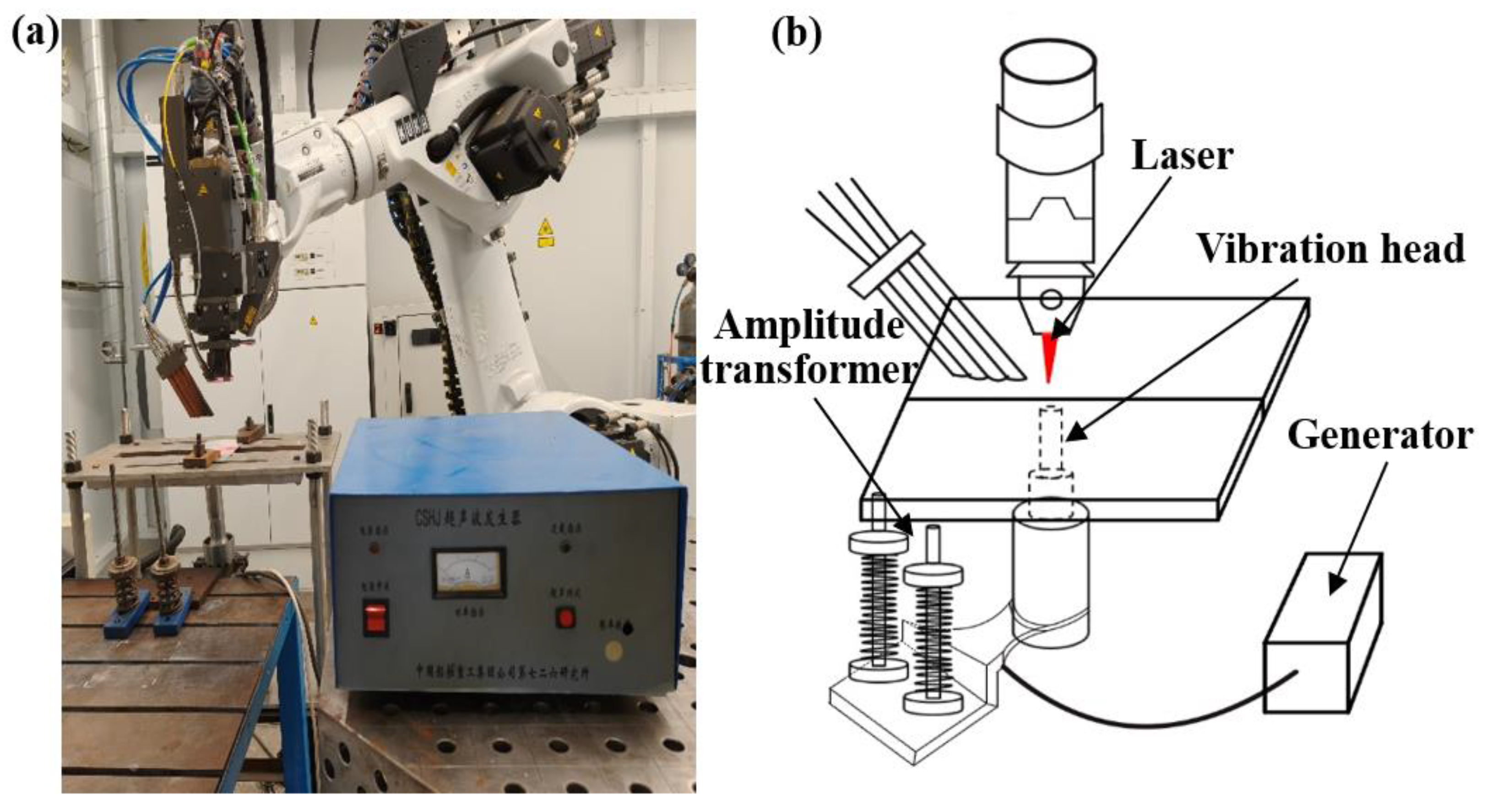- Liu, J.; Zhu, H.Y.; Li, Z.; Cui, W.F.; Shi, Y. Effect of ultrasonic power on porosity, microstructure, mechanical properties of the aluminum alloy joint by ultrasonic assisted laser-MIG hybrid welding. Opt. Laser Technol. 2019, 119, 105619. [Google Scholar] [CrossRef]