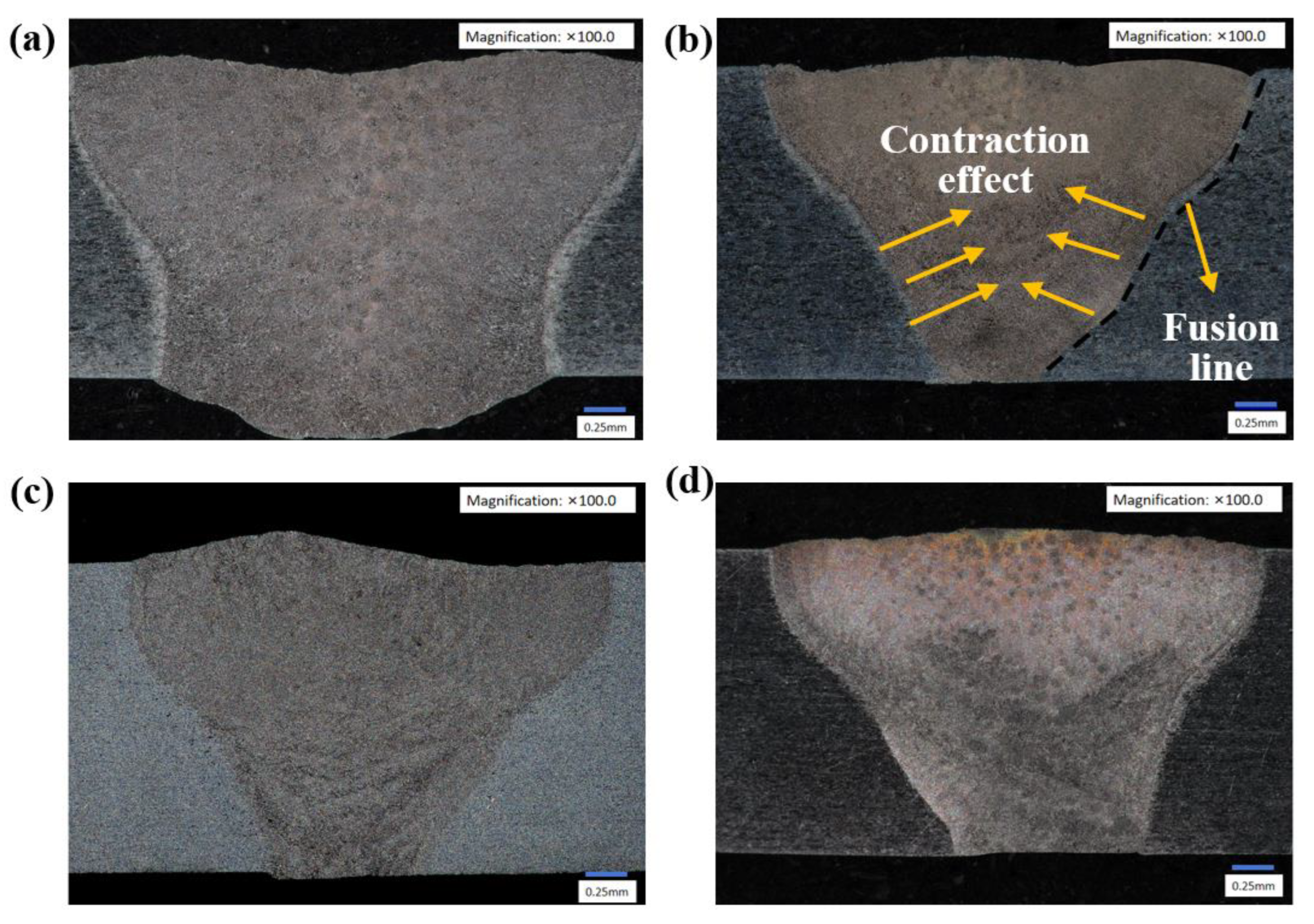 - Wang, M.; Xia, P.; Guo, J.; Yin, Y.; Zhan, X.; Feng, X. Study on the microstructure and mechanical properties of continuous/pulsed hybrid laser shallow penetration welding joints of 6061 aluminium alloy. Opt. Laser Technol. 2025, 180, 111390. [Google Scholar] [CrossRef]