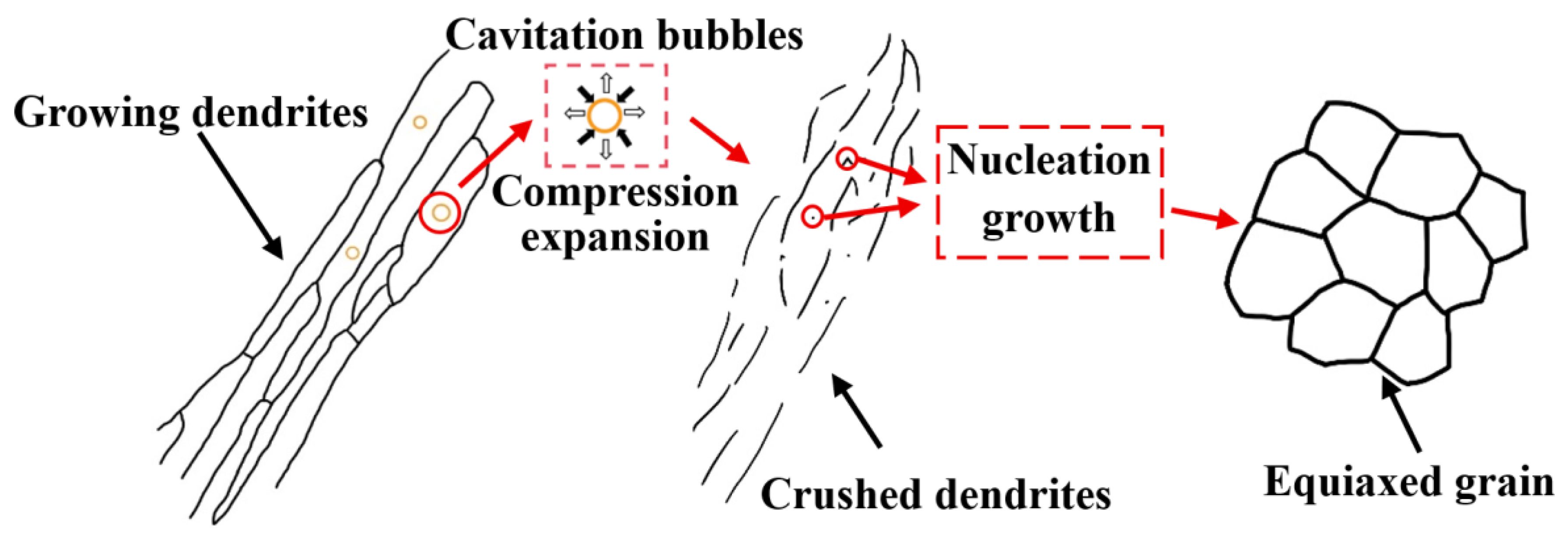 - Wang, F.; Dmitry, E.; Jiawei, M.; Wang, C.N.; Billy, K.; Andrew, K.; Christina, R.; Thomas, C. A synchrotron X-radiography study of the fragmentation and refinement of primary intermetallic particles in an Al-35 Cu alloy induced by ultrasonic melt processing. Acta Mater. 2017, 141, 142–153. [Google Scholar] [CrossRef]