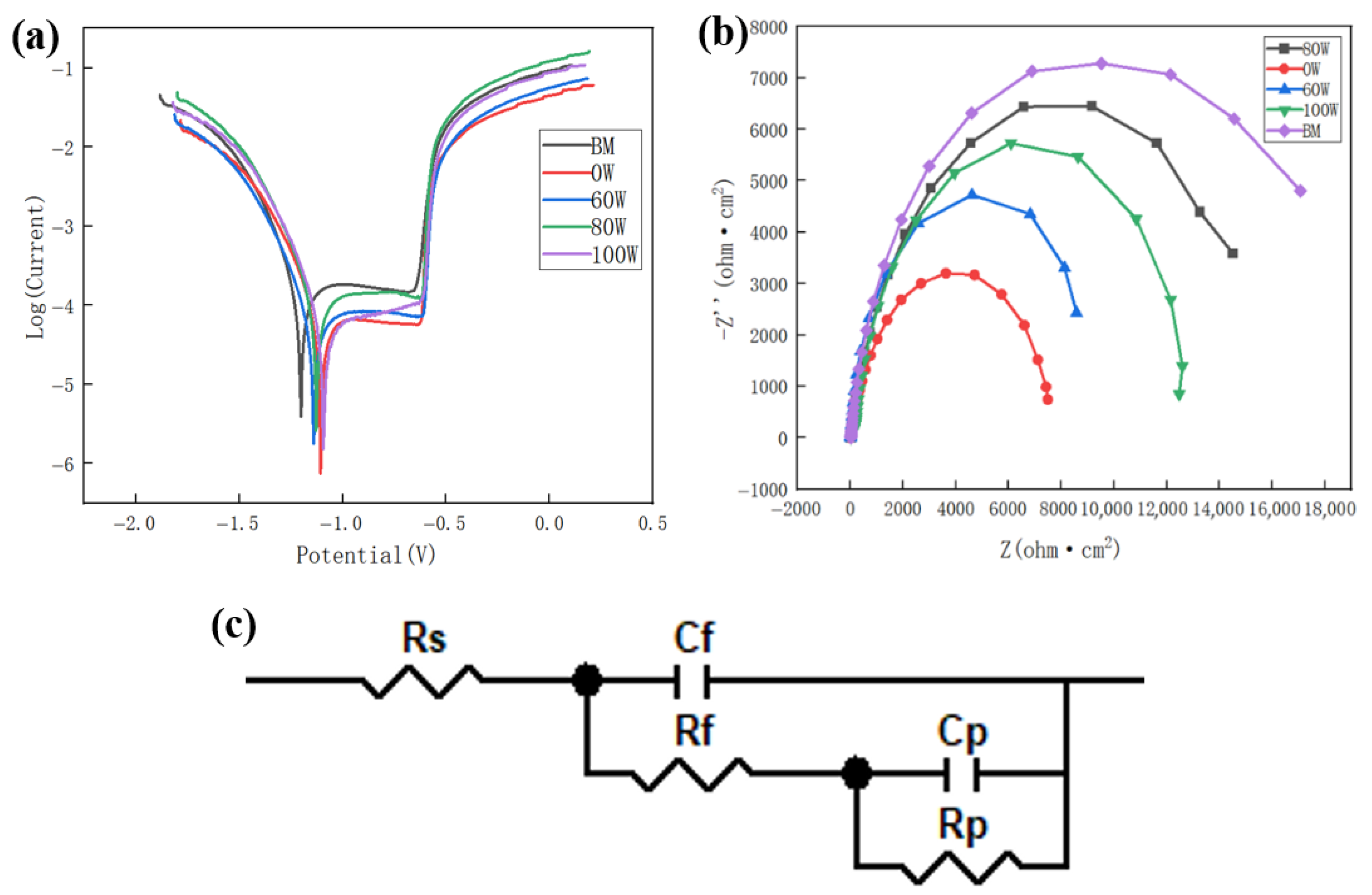 - The area and number of corrosion pits decreased with ultrasonic assistance. The optimal corrosion resistance was achieved at 80 W ultrasonic power, representing a 19.09% enhancement compared to ultrasonic treatment. This quantifies the substantial benefit of ultrasound for applications in corrosive environments.