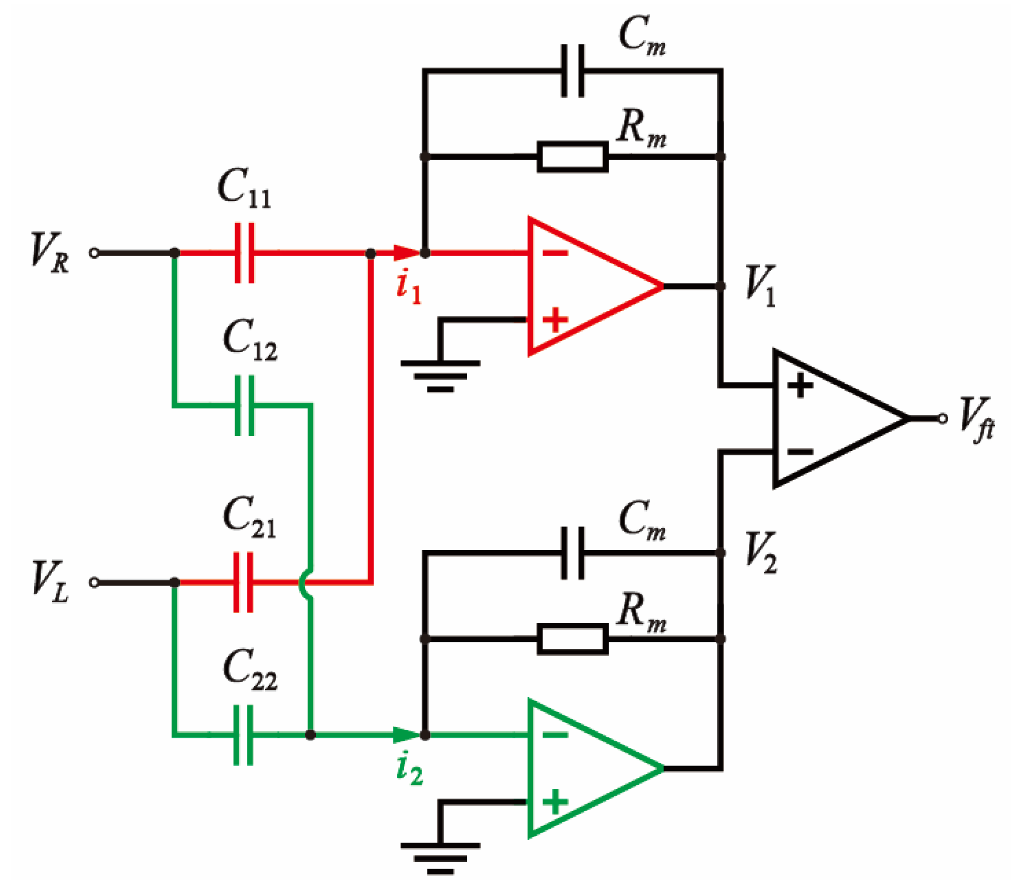 Figure 2 illustrates the labeling convention used for feedthrough capacitances: the first subscript indicates the polarity of the drive electrode, and the second denotes that of the sense electrode (“1” represents the positive AC signal applied to the electrode, and “2” represents the negative AC signal). The differential excitation signals are defined as