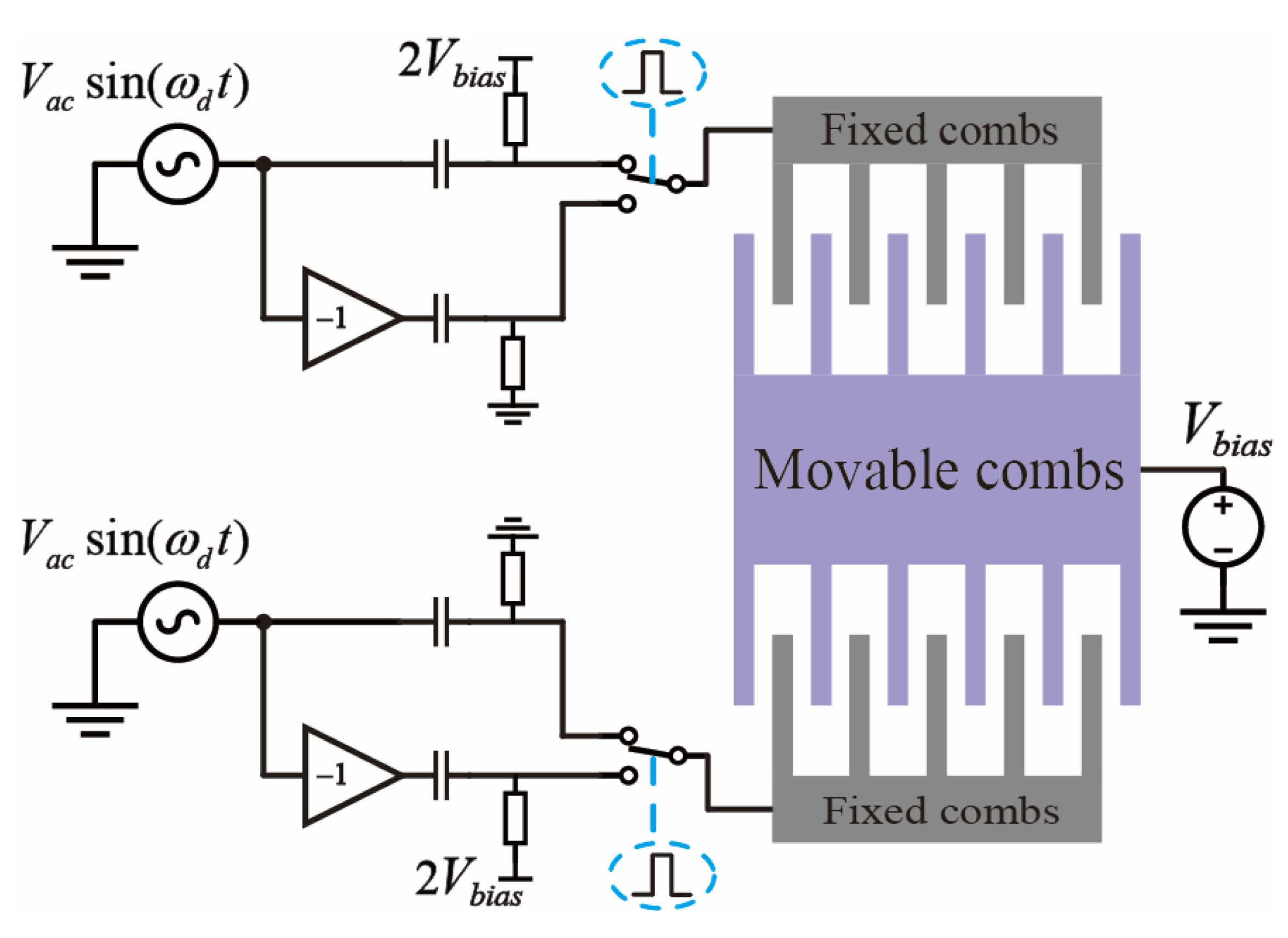 In MEMS gyroscopes, electrostatic excitation is a widely adopted actuation method, often realized through a differential push-pull configuration. This approach involves applying two sinusoidal signals, possessing identical amplitude and opposing phase, to the drive electrodes. The resulting feedback force