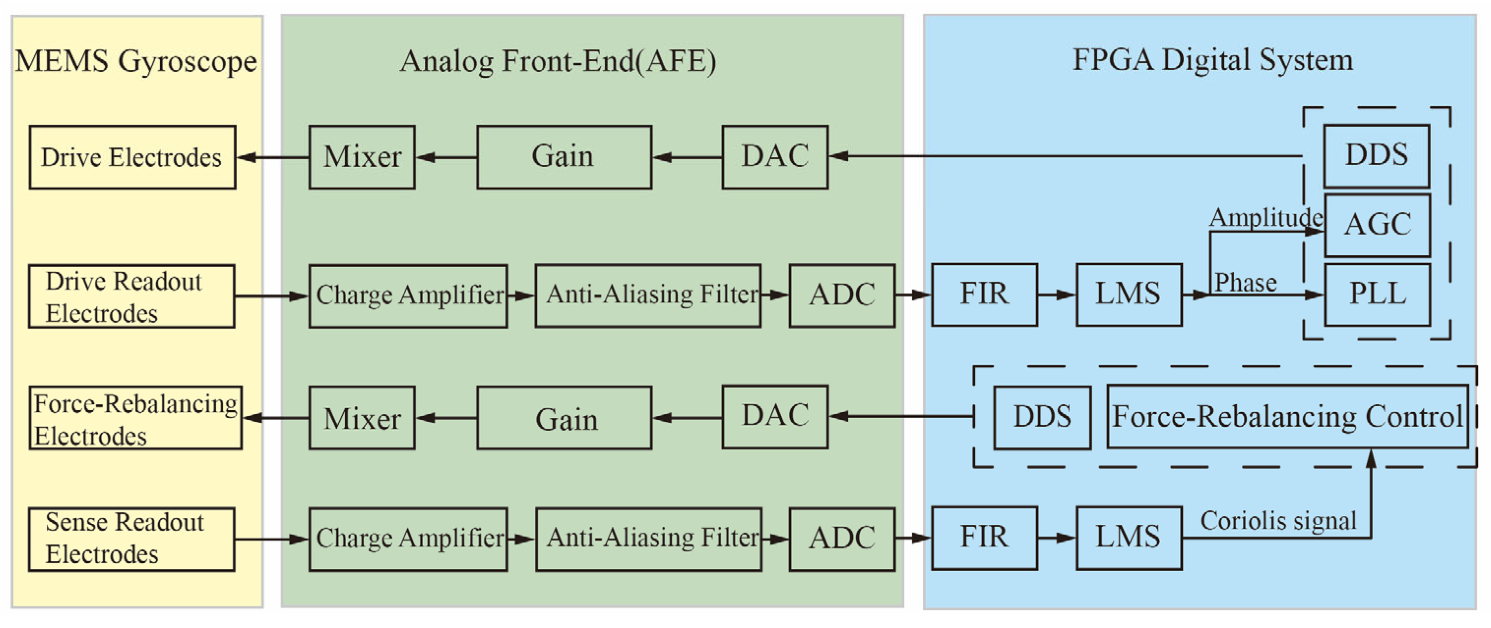 Figure 4 illustrates the Mixed-Frequency Excitation Structure and Control System constructed based on the mixed-frequency excitation signal generation circuit. A Phase-Locked Loop (PLL) and an Automatic Gain Control (AGC) scheme are employed to achieve closed-loop control of the gyroscope’s drive mode. Simultaneously, a force-rebalancing scheme is adopted to implement closed-loop sensing. A mixed-frequency module is integrated into the drive/force-rebalancing excitation signal generation circuit. In the readout path, an anti-aliasing low-pass filter is employed to preliminarily filter the mixed-frequency feedthrough signal, thereby ensuring its separation from the desired signal and precluding aliasing during ADC sampling. Upon its entry into the digital processing domain, the digitized signal is subjected to a Finite Impulse Response (FIR) bandpass filter for the further suppression of the feedthrough. Ultimately, a Least Mean Squares (LMS) demodulation algorithm is utilized to extract the control parameters for the drive and sense loops, with a Proportional-Integral (PI) controller executing the closed-loop control.