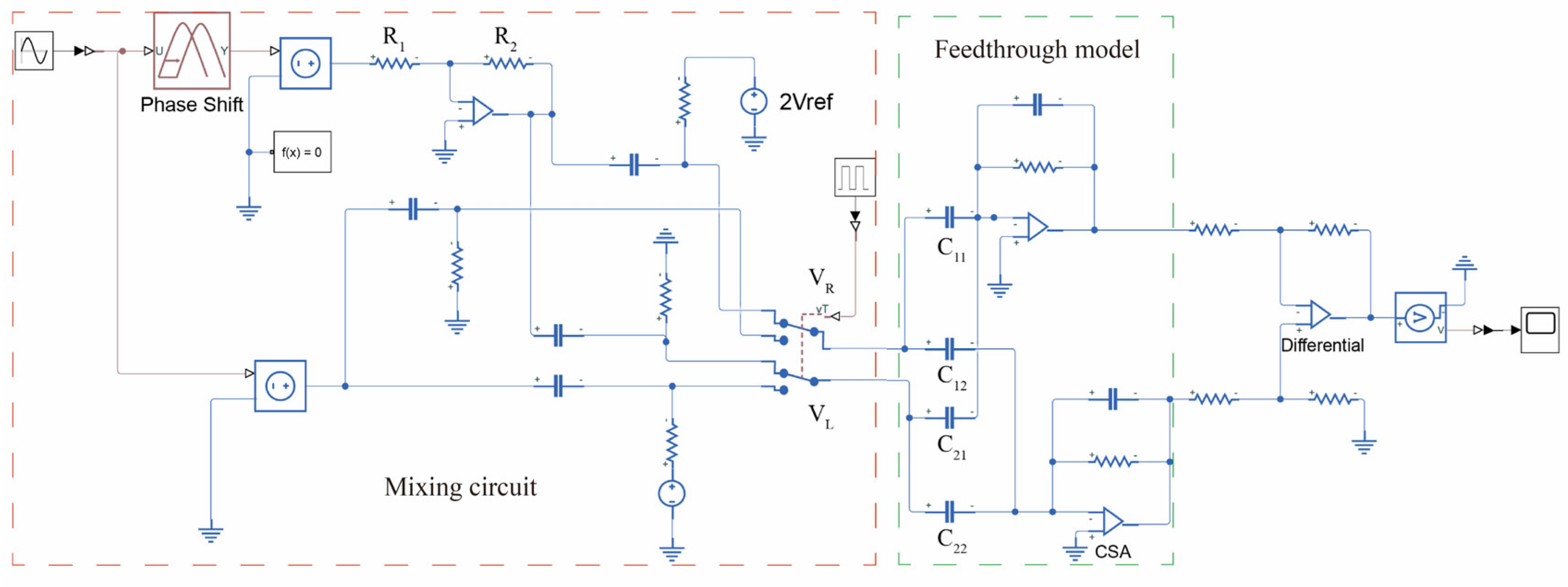17]. As the dominant feedthrough originates from capacitive coupling between the drive and sense electrodes in the sense mode, the feedthrough capacitance model is accordingly simplified, as illustrated in