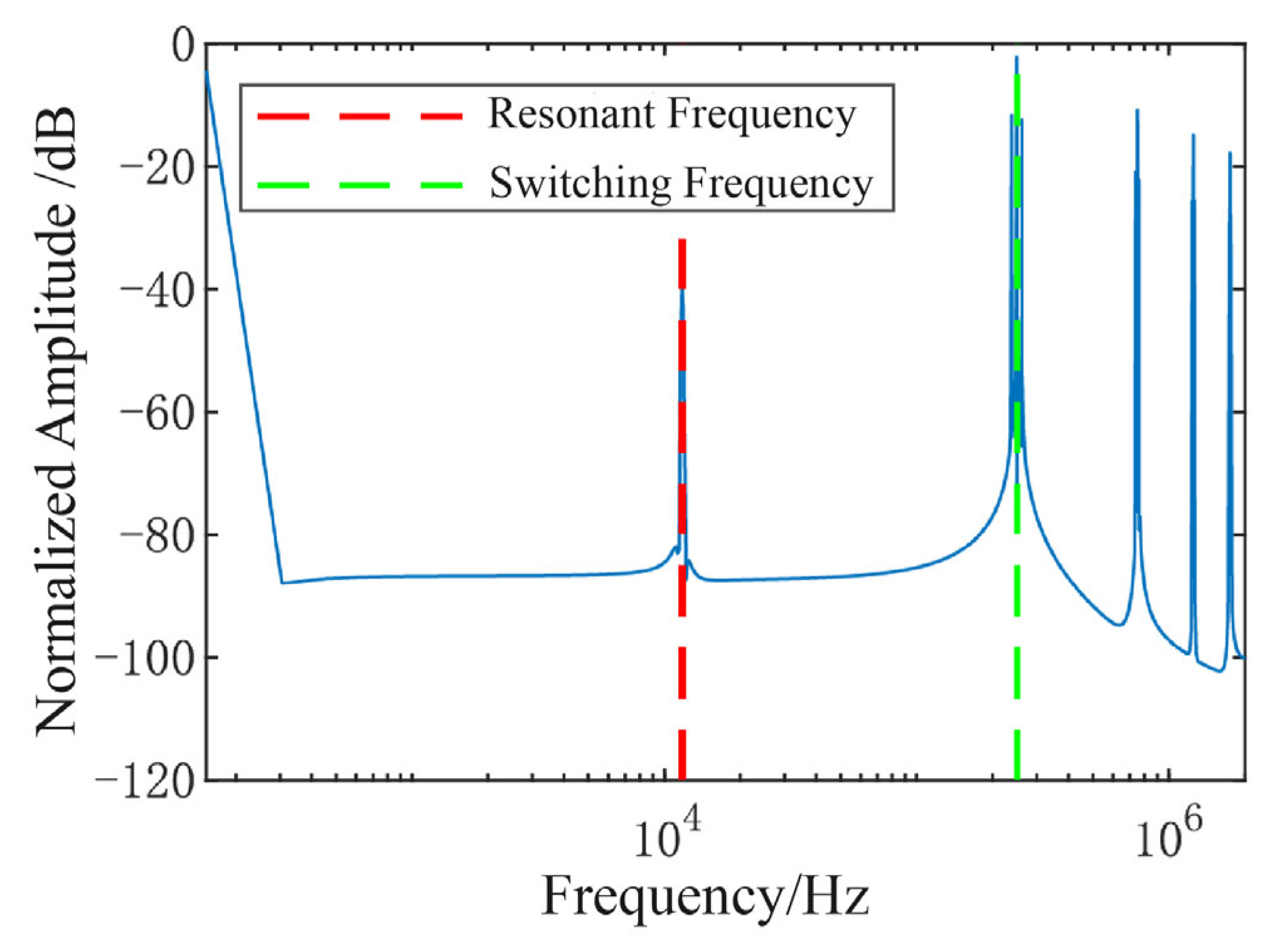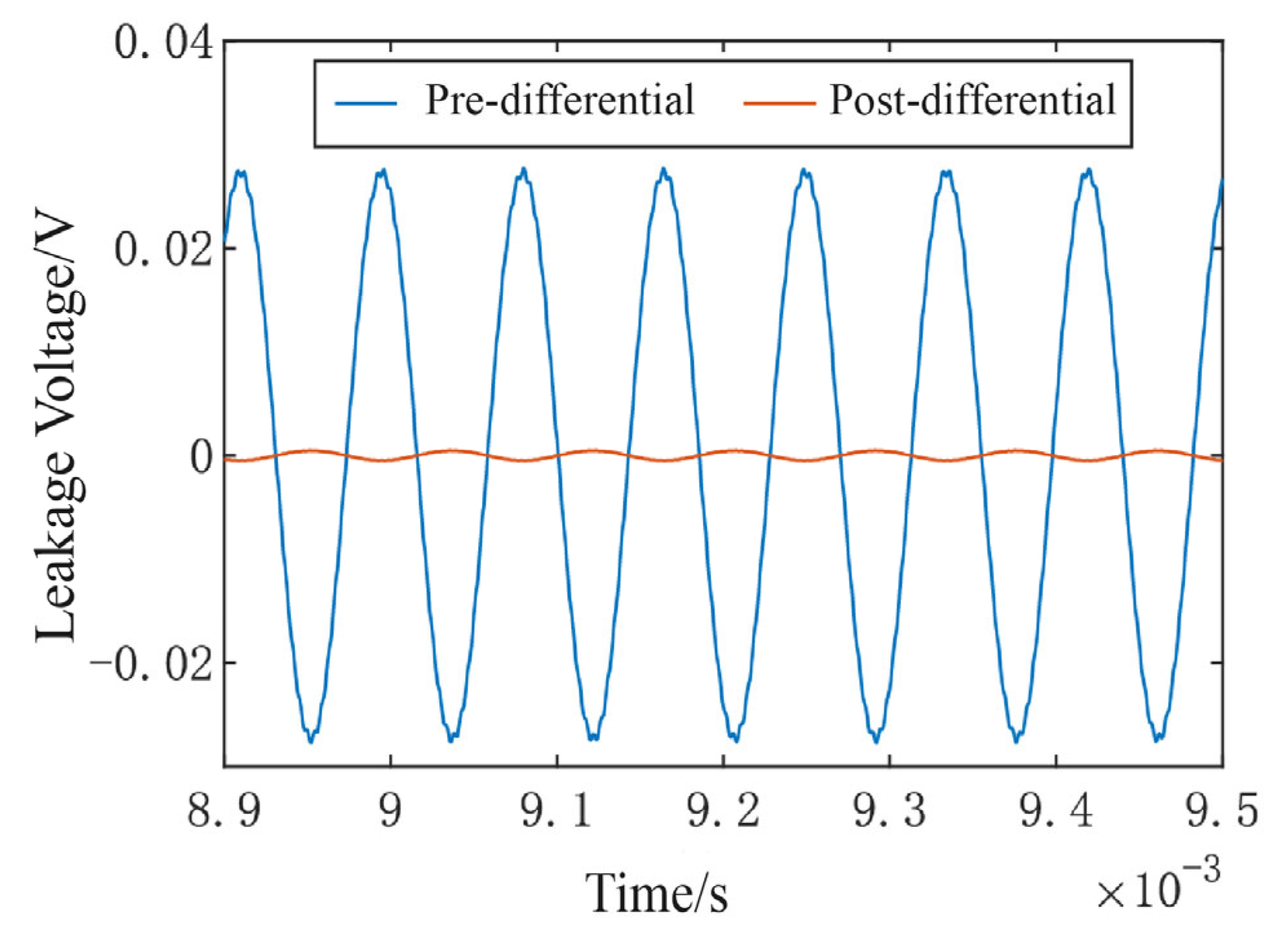 are assumed to be identical, leading to fundamental frequency residual that exhibits a common-mode characteristic. Consequently, such a residual can be effectively suppressed using differential circuit techniques. To verify this behavior, a non-ideal mixed-frequency excitation signal is applied to the feedthrough capacitance model. After passing through a low-pass filter to eliminate high-frequency components, the residual fundamental frequency is extracted and analyzed. The corresponding simulation results are illustrated in