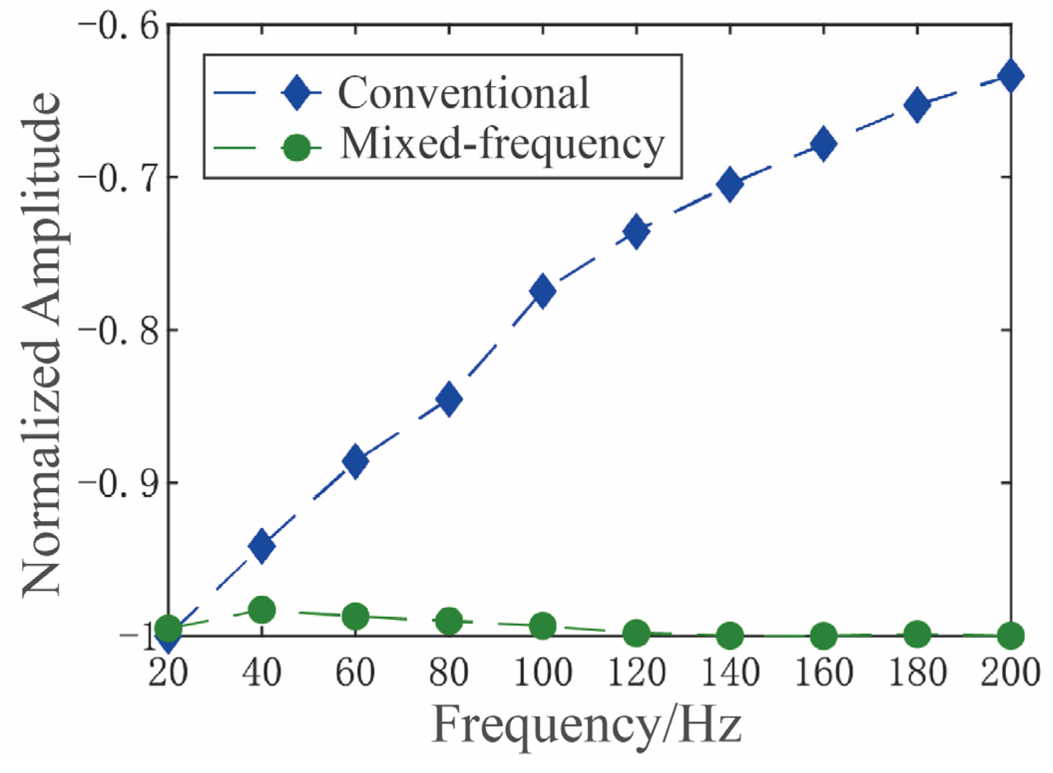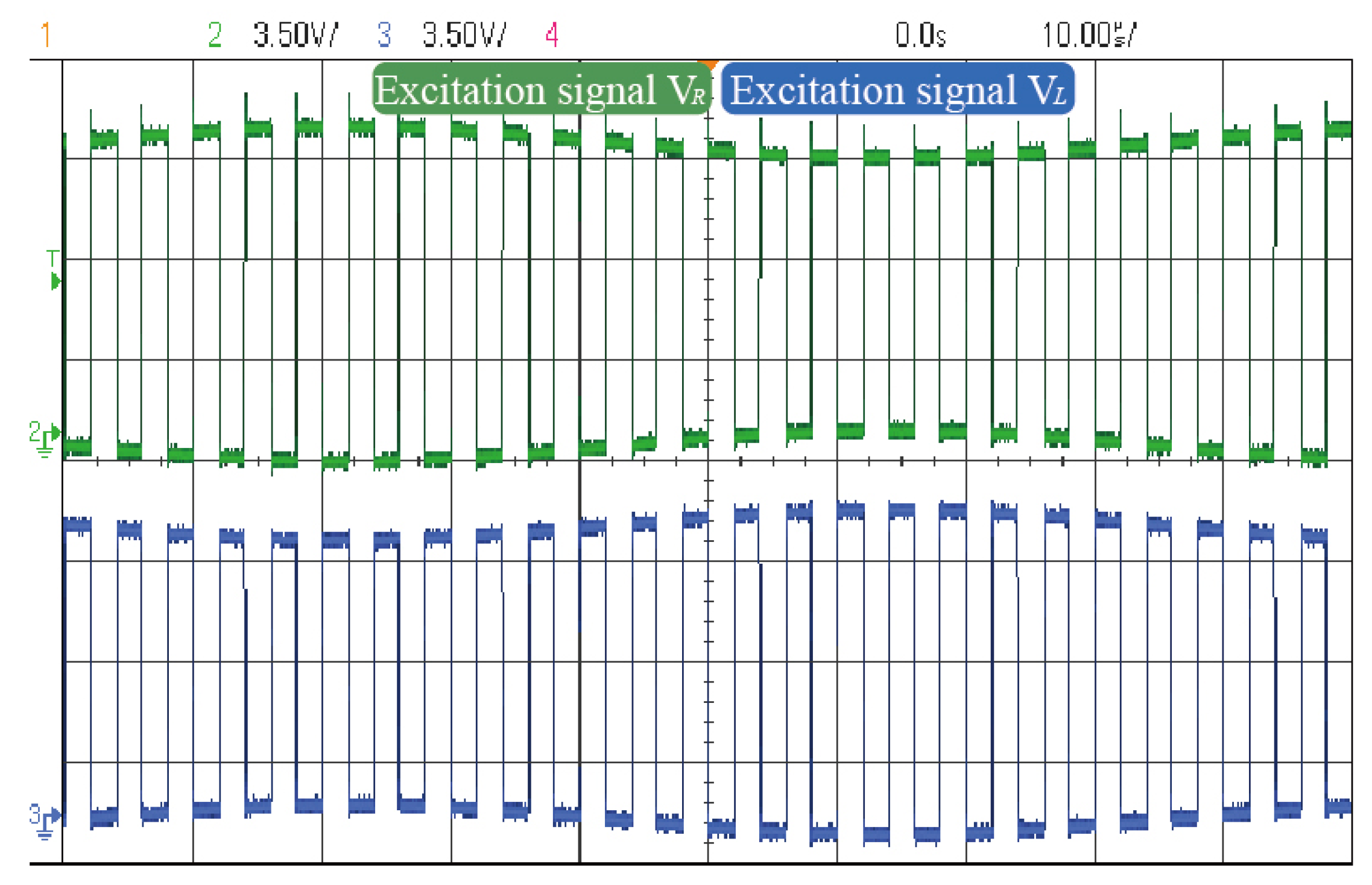 Figure 9 presents the oscilloscope-captured waveform of the mixed-frequency excitation signal. The mixed-frequency excitation signal exhibits an envelope modulation pattern, where the outer envelope shares the same frequency and amplitude as the input sinusoidal signal. The two mixed components are 180° out of phase in their envelope waveforms. Additionally, the square-wave carriers possess identical frequencies and maintain a 180° phase difference, in agreement with theoretical predictions.