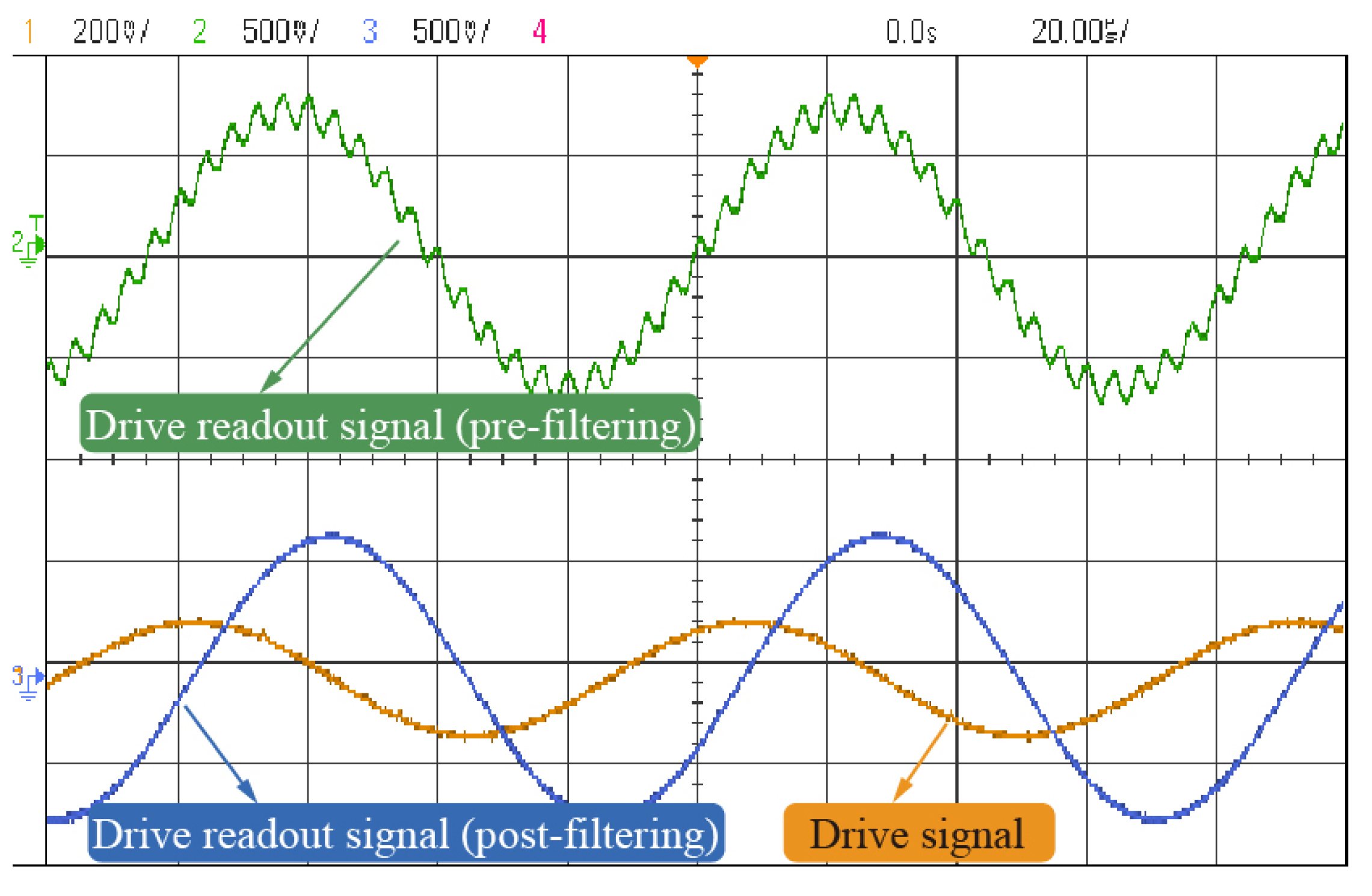Figure 10 shows the waveform of the stabilized drive-mode signal before and after filtering. The comparison indicates that high-frequency feedthrough components are effectively suppressed. Additionally, the filtered readout signal exhibits a 90° phase shift with respect to the original drive signal, confirming that the gyroscope is operating at resonance.
