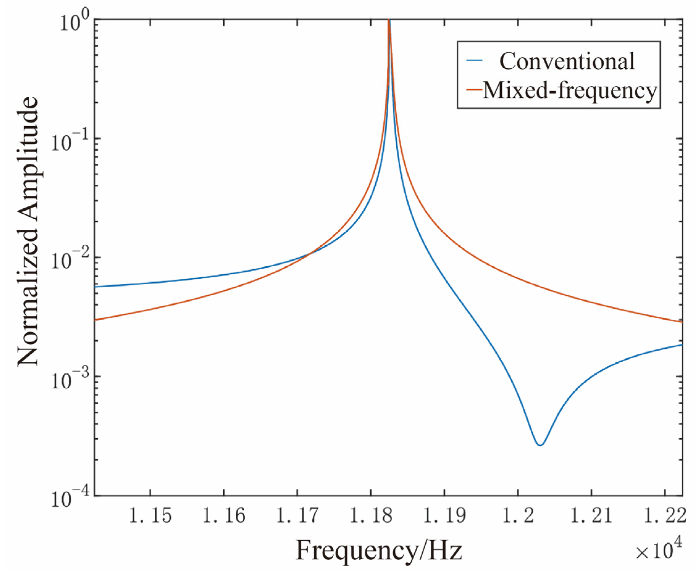 24]. To validate the effectiveness of the proposed mixed-frequency excitation approach in suppressing feedthrough interference, open-loop frequency response measurements were carried out under both the conventional and mixed-frequency excitation conditions. During these experiments, the excitation amplitude was kept constant while the input frequency was linearly swept across a ±400 Hz range centered around the sense-mode resonant frequency. The corresponding frequency response curves are presented in
