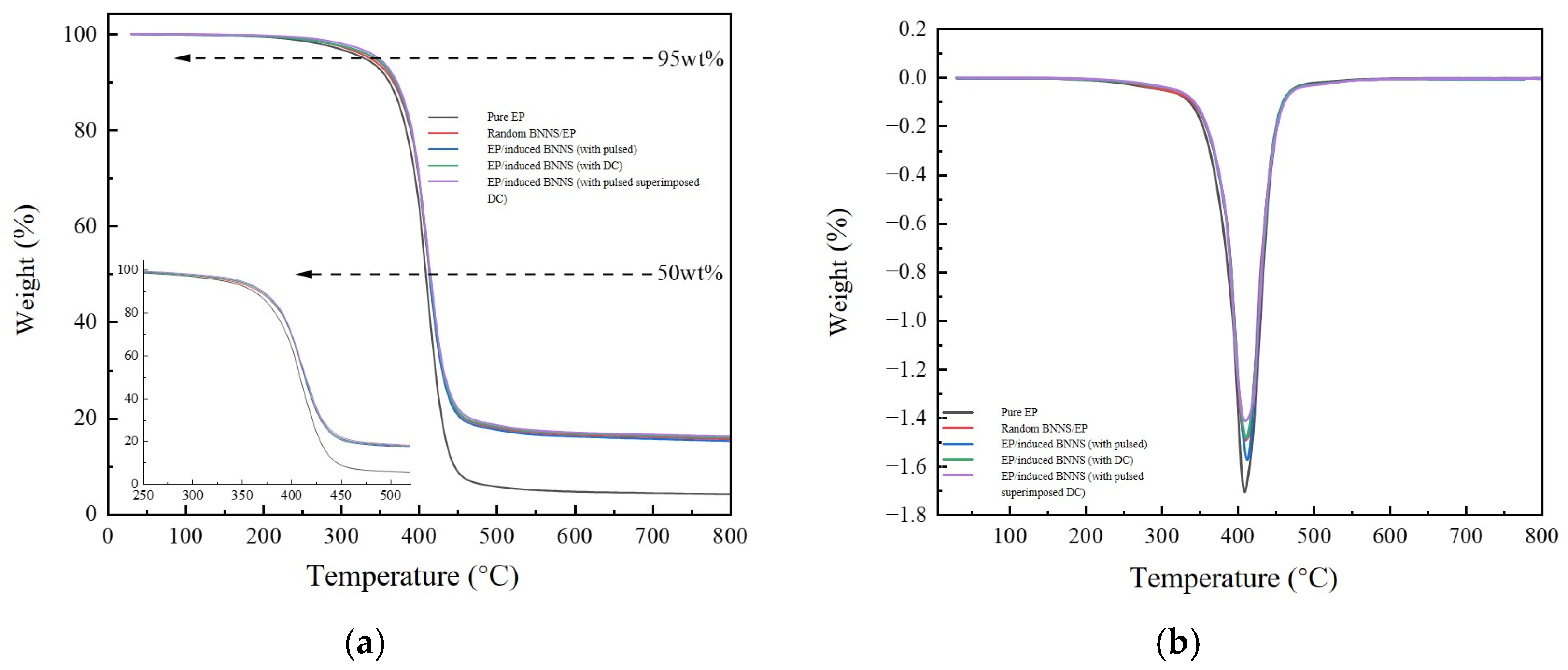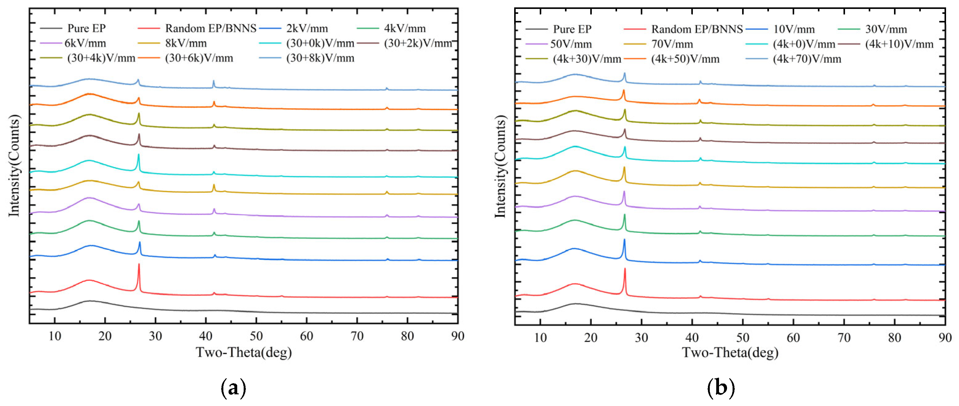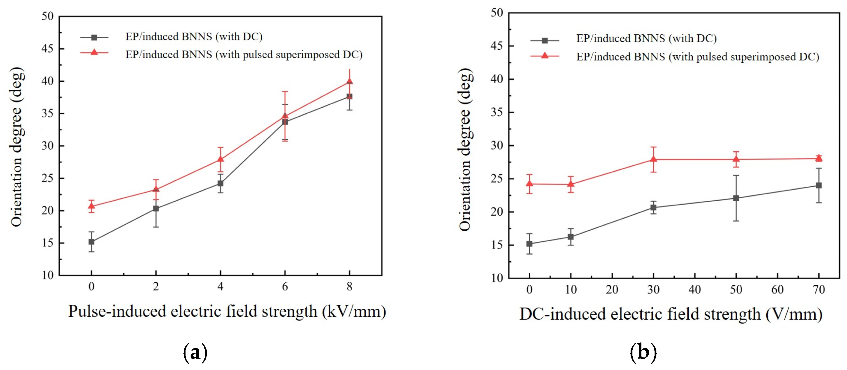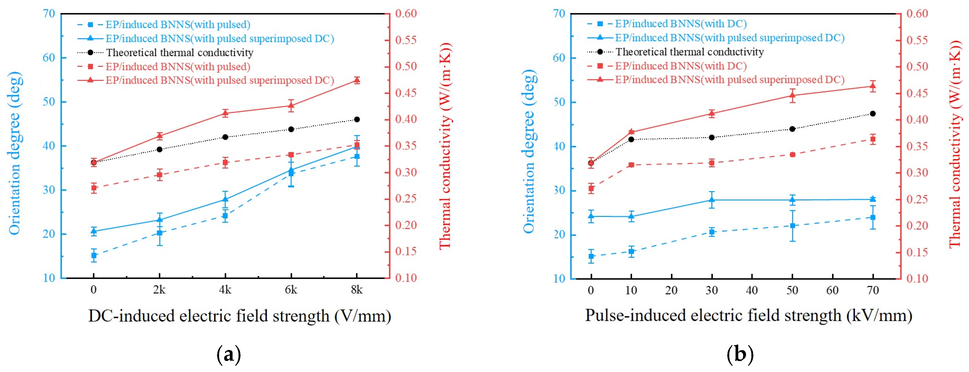 - Mi, Y.; Peng, Y.; Liu, W.; Deng, L.; Shu, B. The Influence of Microsecond Pulsed Electric Field and Direct Current Electric Field on the Orientation Angle of Boron Nitride Nanosheets and the Thermal Conductivity of Epoxy Resin Composites. Micromachines 2025, 16, 413. [Google Scholar] [CrossRef]