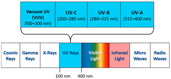 Ultraviolet (UV) radiation occupies the invisible band of the electromagnetic spectrum, with wavelengths ranging from 100 to 400 nm. UV radiation is further classified into four categories, namely, UV-A (315–400 nm), UV-B (280–315 nm), UV-C (200–280 nm), and Vacuum UV (VUV) (l00–200 nm). The sun is one of the sources of UV light, though substantial amounts of its light are screened out via the absorption of atmospheric gases [1]. The full spectrum of electromagnetic waves is depicted in Figure 1.
