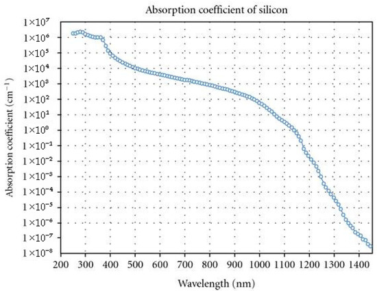 Wavelength-dependent absorption coefficient of silicon. Reproduced from [51] (Journal of Nanotechnology, 2012), licensed under CC BY 4.0.