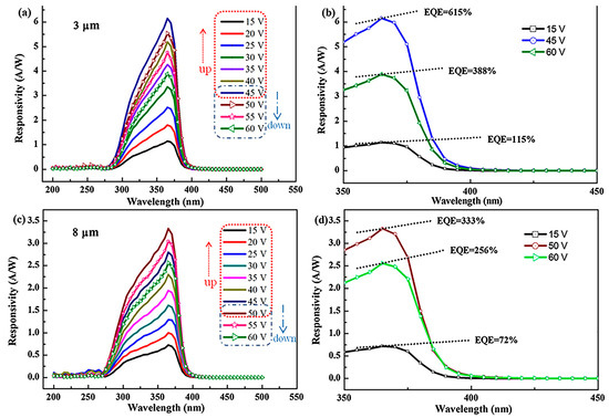 The voltage bias is the external voltage applied across the electrode of a photodetector to separate photogenerated electrons and holes in typical photoconductive detectors or even accelerate them into hot carriers with huge kinetic energy, such as in an avalanche photodiode. Figure 3a,b show the R versus UV wavelength for various bias voltages, while Figure 3c,d show the EQD versus UV wavelengths for various bias voltages in a photodetector. As the bias voltage rises from zero, R and EQE increase until a given bias voltage. This is simply due to the fact that enhanced fields increase the drift current but suppress the radiative recombination rate. However, when increasing the bias voltage beyond the given point, defect state-mediated non-radiative recombination begins to play a significant role due to a widened depletion region in photodiodes such as Shockley–Read–Hall recombination [54,55] and trap-assisted tunneling [56,57,58].